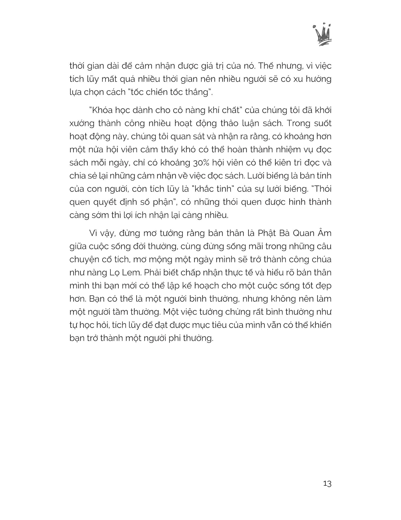 Tôi luôn hy vọng những cô gái đang theo dõi cuốn sách này có thể ít bị tổn thương nhất trong các mối quan hệ. Giữa sự ồn ào náo nhiệt của thế giới này, hãy cứ giữ cho mình một trái tim yên vui và điều làm nên sự thu hút nhất của người phụ nữ hiện đại chính là độc lập, tự chủ và có chính kiến riêng của mình.