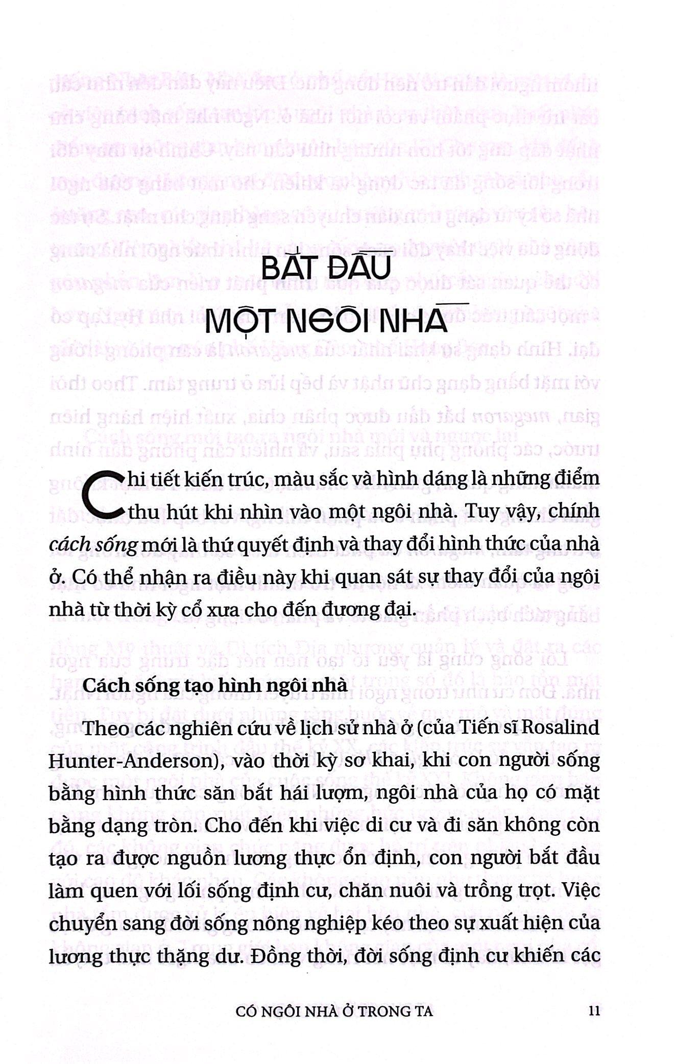Cuốn sách là những ghi chú, biên khảo về kiến trúc gồm 2 phần chính: Nhà, trong, trước, ngoài, sau và Hình thái, hình & thái. Tác giả đề cập đến mọi khía cạnh của kiến trúc (màu sắc, sánh sáng và bóng tối,...) trải dài từ các mô hình kiến trúc của mỗi thời đại. Đi sâu vào tìm hiểu những điểm nổi bật đã làm nên đặc trưng của lối kiến trúc một thời. Và cách vận hành, đột phá của kiến trúc hiện đại, bên cạnh đó kiến trúc cũng phản ánh được lối sống của một cá nhân hay cả cộng đồng, âm thầm thay đổi nếp sống của con người.