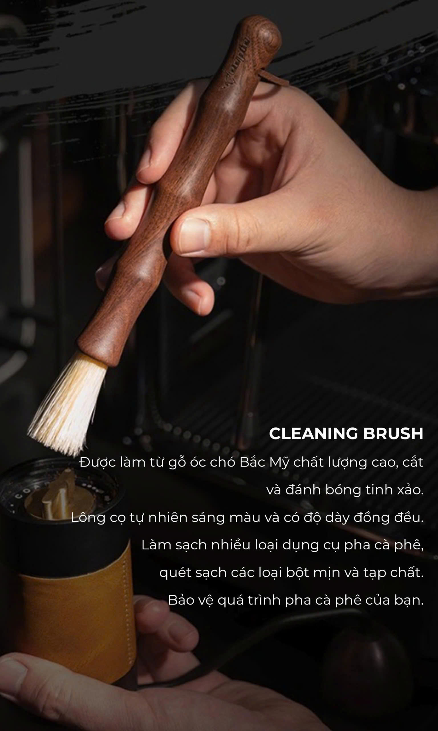 Mua tại TiktokCỌ QUÉT CÀ PHÊ CÁN GỖ ỐC CHÓ FEEPIE Sau mỗi lần pha espresso , cà phê còn sót lại trong portafiler . Nếu trong khả năng cho phép , chúng ta nên rửa portafilter với nước để loại bỏ hoàn toàn bột cà phê cũ còn sót lại . Nhưng nếu trong giờ cao điểm , bạn cần pha liên tục thì cọ vệ sinh máy là một giải pháp cho bạn . Với sợi cọ mềm mại , bạn chỉ cần quét nhẹ portafilter và các bộ phận khác của máy pha cà phê espresso để loại bỏ bột và bụi cà phê một cách nhanh chống và hiệu quả nhất . Sử dụng để quét sạch bột cà phê trong portafilter . Thiết kế đầu cọ tròn dễ dàng sử dụng . Sợi cọ mềm mại quét sạch nhanh chóng .