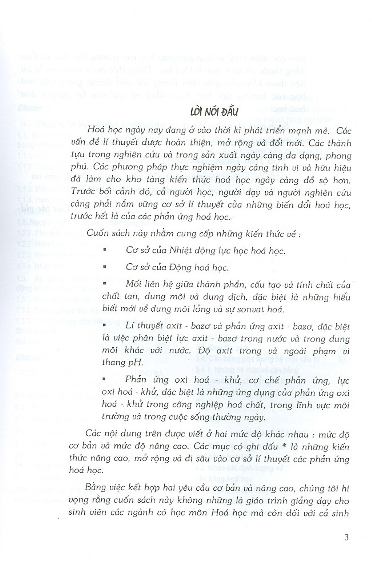 Hoá học ngày nay đang ở vào thời kì phát triển mạnh mẽ. Các vấn đề lí thuyết được hoàn thiện, mở rộng và đổi mới. Các thành tựu trong nghiên cứu và trong sản xuất ngày càng đa dạng, phong phú. Các phương pháp thực nghiệm ngày càng tinh vi và hữu hiệu đã làm cho kho tàng kiến thức hoá học ngày càng đồ sộ hơn. Trước bối cảnh đó, cả người học, người dạy và người nghiên cứu càng phải nắm vững cơ sở lí thuyết của những biến đổi hoá học, trước hết là của các phản ứng hoá học. Cuốn sách này nhằm cung cấp những kiến thức về : Cơ sở của Nhiệt động lực học hoá học. Cơ sở của Động hoá học. Mối liên hệ giữa thành phần, cấu tạo và tính chất của chất tan, dung môi và dung dịch, đặc biệt là những hiểu biết mới về dung môi lỏng và sự sonuat hoá. Lí thuyết axit - bazơ và phản ứng axit - bazơ, đặc biệt là việc phân biệt lực axit - bazơ trong nước và trong dung môi khác với nước. Độ axit trong và ngoài phạm vi thang pH. Phản ứng oxi hoá - khử, cơ chế phản ứng, lực oxi hoá - khử, đặc biệt là những ứng dụng của phản ứng oxi hoá - khử trong công nghiệp hoá chất, trong lĩnh vực môi trường và trong cuộc sống thường ngày. Các nội dung trên được viết ở hai mức độ khác nhau : mức độ cơ bản và mức độ nâng cao. Các mục có ghi dấu * là những kiến thức nâng cao, mở rộng và đi sâu vào cơ sở lí thuyết các phản ứng hoá học. Bằng việc kết hợp hai yêu cầu cơ bản và nâng cao, chúng tôi hi vọng rằng cuốn sách này không những là giáo trình giảng dạy cho sinh viên các ngành có học môn Hoá học mà còn đối với cả sinh viên các năm cuối và học viên cao học các trường Đại học và Cao đẳng thuộc chuyên ngành Hoá học. Đồng thời cuốn sách còn là tài liệu tham khảo cho giáo viên Trung học phổ thông, giảng viên hoá học các trường Đại học, Cao đẳng và các cán bộ nghiên cứu hoá học.