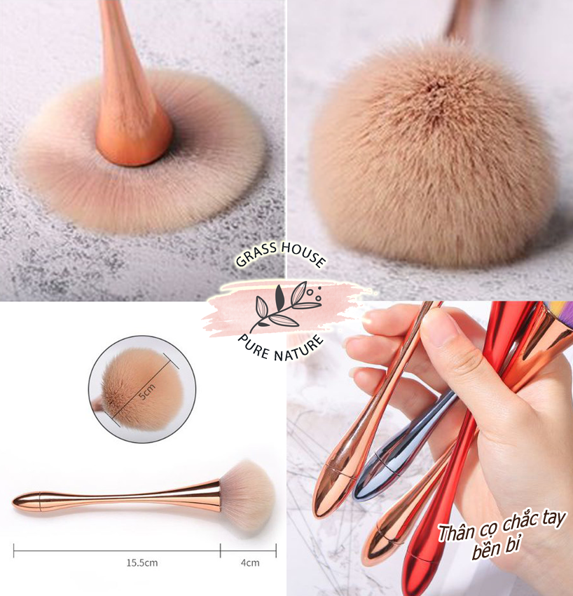 - Thân cọ có chiều dài phù hợp, tay cầm vòng tròn rắn, nhẹ dễ di chuyển Chất liệu lông: sợi nhân tạo, độ bền cao, ko dễ rụng lông, độ phủ phấn tốt