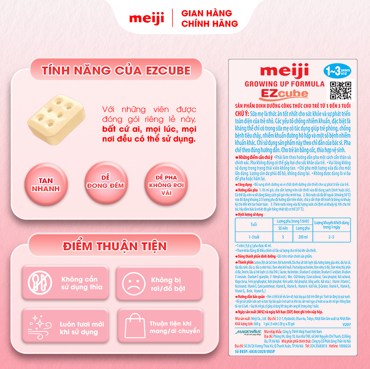 - Meiji Growing Up Formula EZcube là sản phẩm dạng viên, đóng gói trong hộp giấy hình hộp chữ nhật gồm 20 thanh/ hộp và 5 viên/ thanh, trọng lượng 560g. ĐẶC ĐIỂM SẢN PHẨM