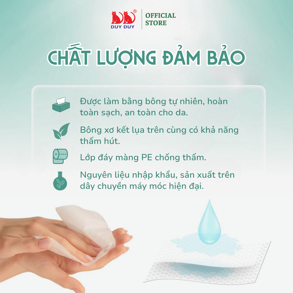 Được làm từ sợi vải không dệt, rất dai, mềm, mịn và có độ đàn hồi cao. Dạng khô, thích hợp cho làn da nhạy cảm nhất. An toàn cho bé, tiết kiệm cho mẹ.