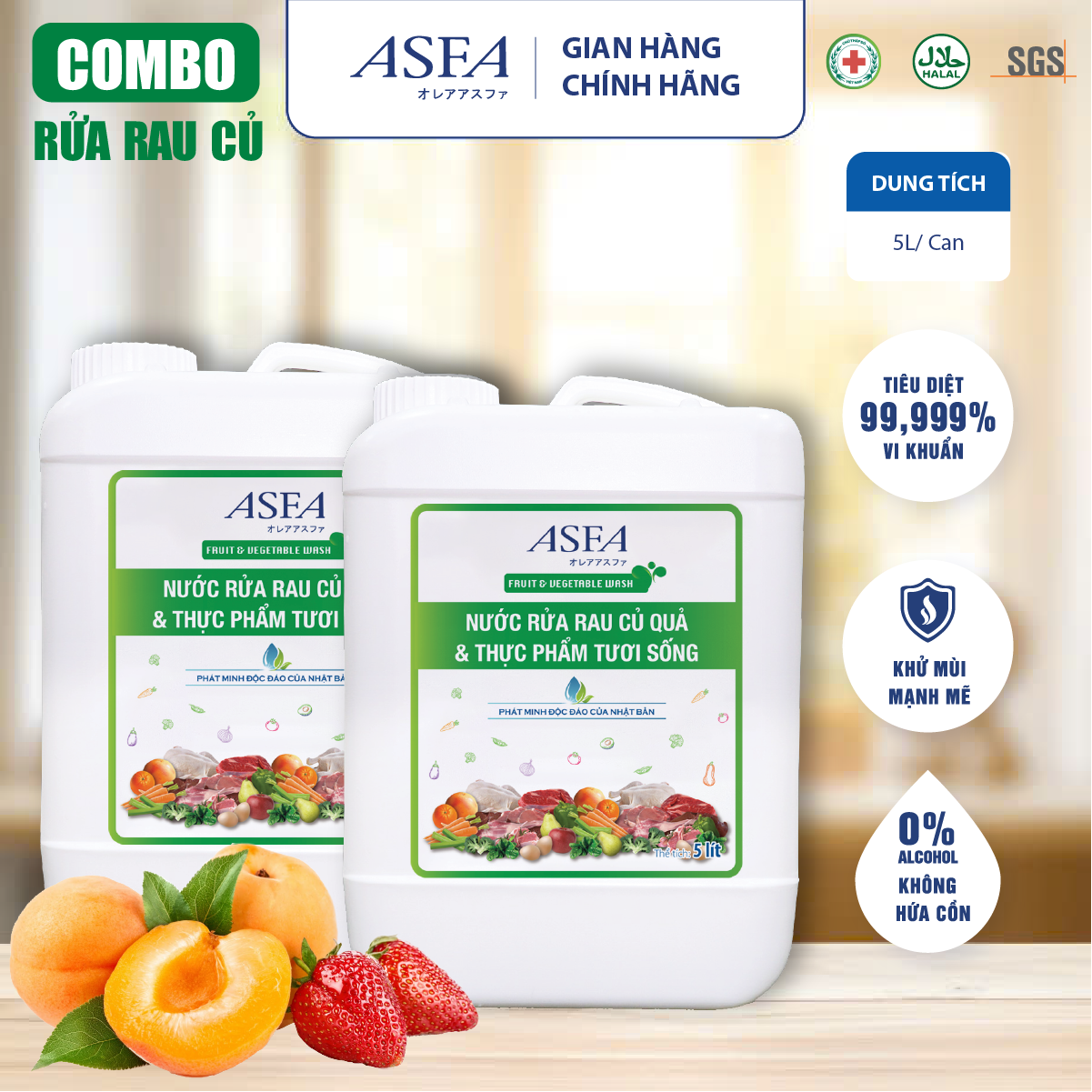 ✨[Combo 2 Can] Nước Rửa Rau Củ Quả và Thực Phẩm Tươi Sống Khử Mùi, Diệt Khuẩn ASFA Fruits & Vegetable 5 Lít