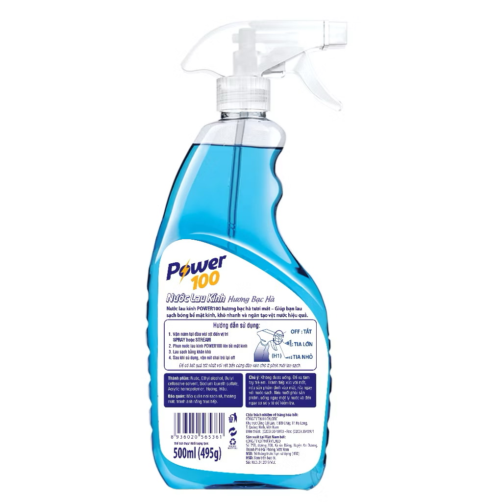 - Nước Lau Kính Power100 Hương Bạc Hà (580ml) với hoạt chất tẩy rửa thông minh, nước lau kính POWER100 sẵn sàng tẩy sạch mọi vết bẩn cứng đầu, giúp bề mặt kính KHÔ NHANH