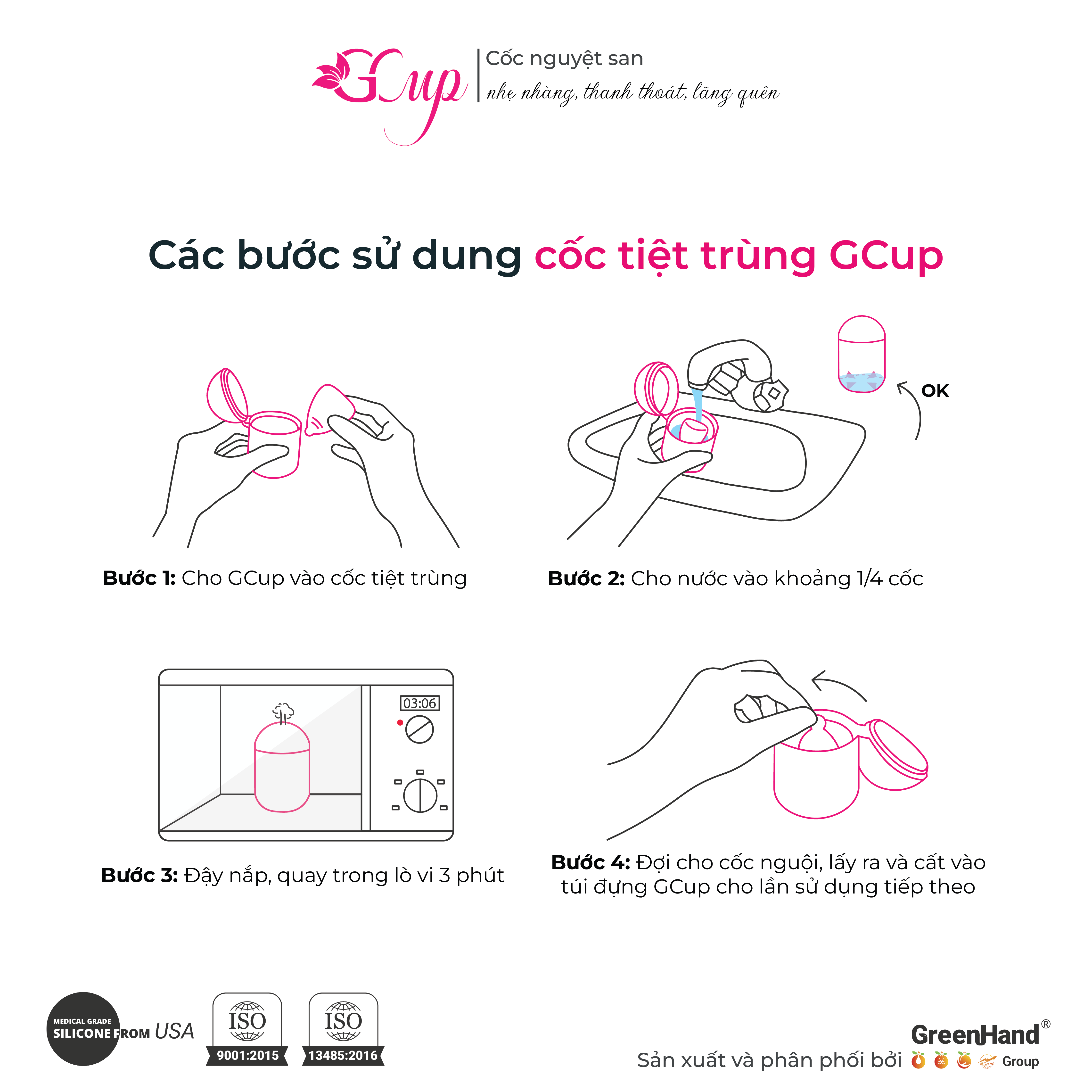 THÔNG TIN SẢN PHẨM:Hộp đựng sản phẩm bao gồm: 2 cốc nguyệt san, túi vải, cốc tiệt trùng, HDSDThương hiệu: GCupXuất xứ sản phẩm: Công ty cổ phần TM SX & DV GreenHand Solutions️ Công dụng:Sản phẩm t...