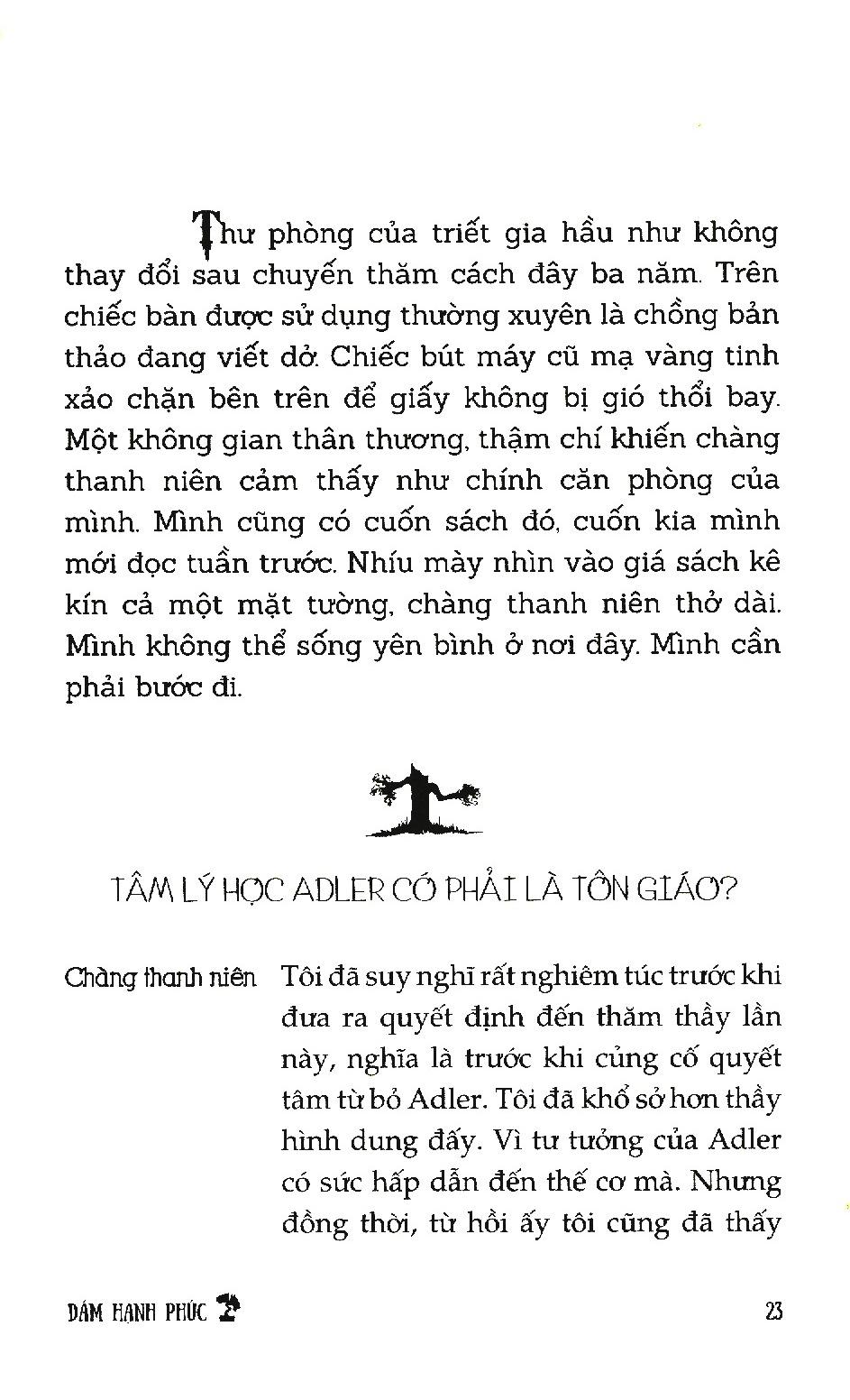 Dưới hình thức một cuộc đối thoại giữa Chàng thanh niên và Triết gia, cuốn sách trình bày một cách sinh động và hấp dẫn những nét chính trong tư tưởng của nhà tâm lý học Alfred Adler, người được mệnh danh là một trong “ba người khổng lồ của tâm lý học hiện đại”, sánh ngang với Freud và Jung. Khác với Freud cho rằng quá khứ và hoàn cảnh là động lực làm nên con người ta của hiện tại, Adler chủ trương “cuộc đời ta là do ta lựa chọn”, và tâm lý học Adler được gọi là “tâm lý học của lòng can đảm”.