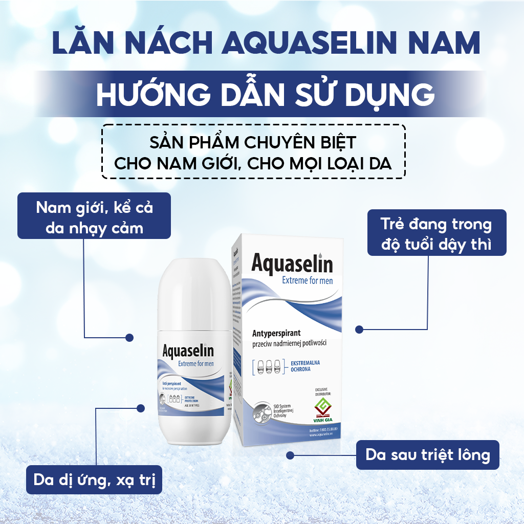 Mua tại TiktokAquaselin Lăn khử mùi Aquaselin dành cho nam giới dùng cho vùng nách đổ mồ hôi & mùi hôi từ vừa phải đến nhiều. THÀNH PHẦN SẢN PHẨM Thành phần từ thiên nhiên: Aqua, Aluminum Chlorohydrate ( mủ cây hương nhu), Steareth - 2, Octyldodecanol, Steareth - 21,Isopropyl Myristate, Dipropylene Glycol, Panthenol, Bisabolol, Allantoin, Boswellia Serrata Gum CÔNG DỤNG SẢN PHẨM • Sản phẩm lăn nách dành cho nam giới, dùng cho mọi loại da. • Sản phẩm được khuyên dùng cho nam giới khi các sản phẩm khử mùi thông thường không bảo vệ được. CÁCH SỬ DỤNG • Lựa chọn sản phẩm chuyên biệt cho Nam riêng, nữ riêng. • Dùng vào buổi tối 1 tuần từ 2 lần trở lên tùy tình trạng, sau khi tắm và trên vùng nách đã được lau khô. Sáng hôm sau tắm cũng không cần lăn lại • Tẩy da chết định kỳ, tối thiểu 1 tháng/1 lần. Cách đơn giản nhất có thể sử dụng lát chanh chà nhẹ lên vùng nách. ƯU ĐIỂM NỔI BẬT • Tác dụng kéo dài đến vài ngày. • Khô thoáng nhanh. • Có tác dụng cho nhiều đối tượng • Thành phần thiên nhiên. Không mùi, không cồn, không gây thâm nách, không gây ố vàng nách áo. Không chứa chất tạo màu, độ pH trung tính, sản phẩm dành cho mọi loại da. Sản phẩm được hấp thu dễ dàng, không gây nhờn dính • Được sản xuất tại Nhà máy đạt chuẩn GMP châu Âu. Đã được thử nghiệm thực tế: cho hiệu quả và an toàn, dùng được cho cả phụ nữ mang thai, sau sinh, trẻ đang trong độ tuổi dậy thì, da dị ứng, xạ trị hoặc sau triệt lông vẫn dùng được. • Sản phẩm chuyên biệt cho nam và nữ LƯU Ý: MUA HÀNG CHÍNH HÃNG Trên mỗi vỏ hộp sản phẩm, có tem điện tử phủ cào xác thực hàng chính hãng, tem chống hàng giả và logo của Dược phẩm Vinh Gia. Khi mua hàng, Qúy khách hãy kiểm tra TEM HÀNG CHÍNH HÃNG