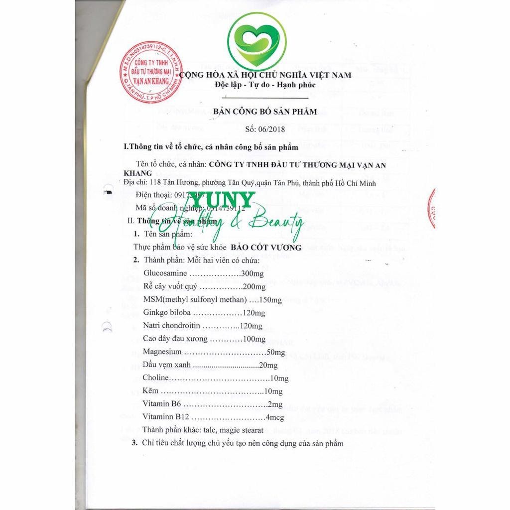 - Thành Phần Viên Uống Bảo Cốt Vương: Mỗi 2 viên có chứa: Rễ cây vuốt quỷ: Ginkgo biloba: Natri Chondroitin: Cao dây đau xương: Magnesium: Dầu vẹm xanh: Choline: Kẽm: Thành phần khác vừa đủ Công Dụng Viên Uống Bảo Cốt Vương: Hỗ trợ tăng tiết dịch khớp, tái tạo mô sụn khớp, giảm khô khớp, giúp khớp vận động linh hoạt Tăng cường chất oxy hóa, khử các gốc tự do Hỗ trợ bảo vệ khớp, giúp giảm các thoái hóa khớp, viem khớp, tê mỏi tay chân Ai Nên Dùng Viên Uống Bảo Cốt Vương: Người mắc các bệnh về khớp cấp và mạn tính, thoái hóa khớp, sung khớp, viem quanh khớp, đau khớp, cứng khớp Người cao tuổi vận động khó khăn, người chấn thương, tê mỏi chân tay Liều & Cách Dùng Viên Uống Bảo Cốt Vương: Uống 2 viên/lần x 2 lần/ngày *Lưu ý: