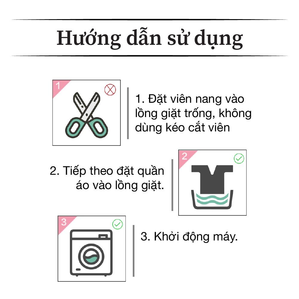 TẠI SAO LỰA CHỌN VIÊN GIẶT QUẦN ÁO thay thế các loại giặt tẩy thông thường? Đơn giản hóa việc giặt giũ chỉ với 1 sản phẩm 1 thao tác: - Đa năng: Tất cả trong 1 viên giặt chất tẩy vết bẩn, chất làm mềm vải, chất khử khuẩn- khử mùi, bảo vệ màu quần áo (tương tự sự kết hợp của nước giặt và nước xả) - Tiện lợi: Dùng được 2-6 kg quần áo chỉ với 1 viên; Dùng được cho cả máy giặt cửa trên và máy giặt cửa trước ; Dùng khi giặt bằng nước