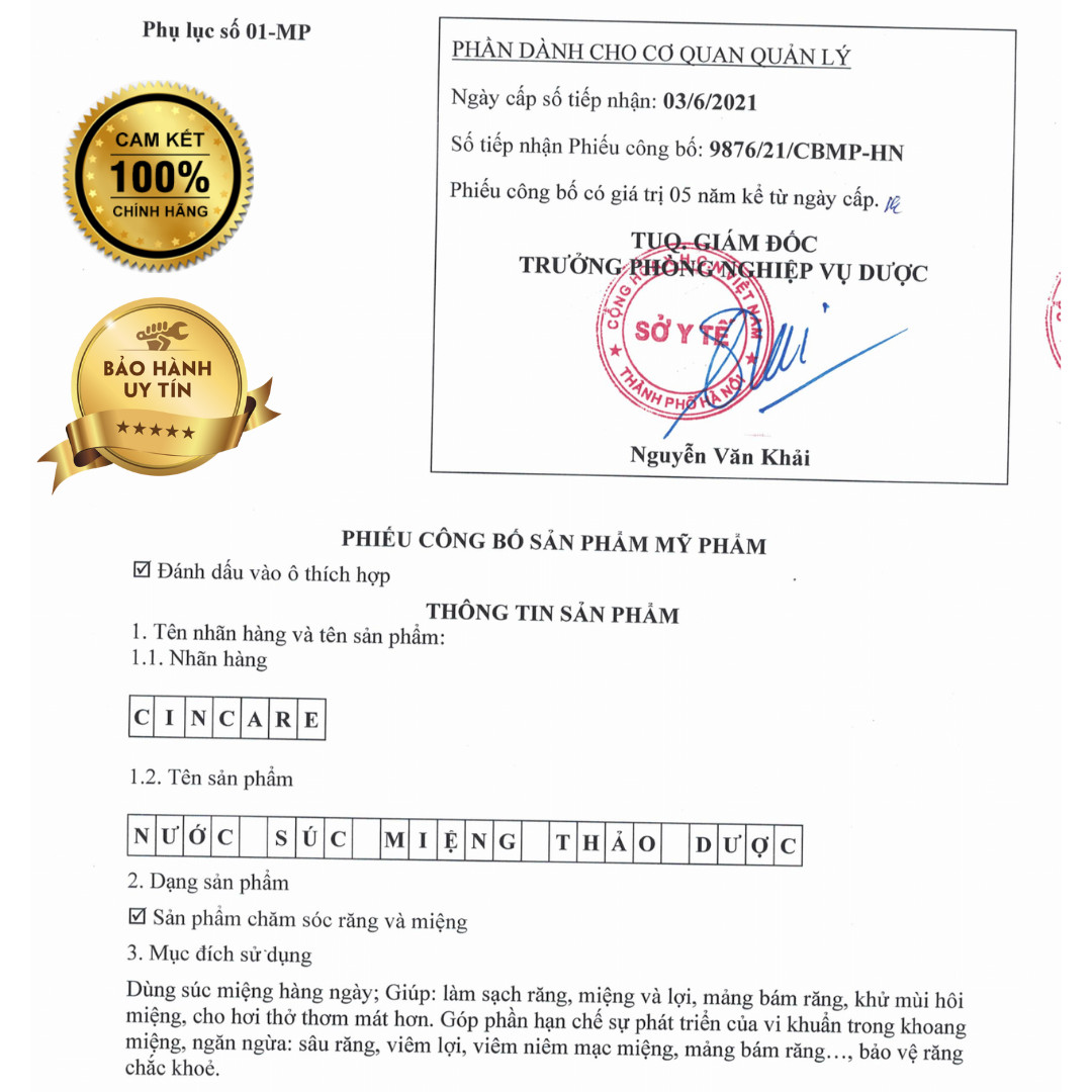 Mua tại TiktokNƯỚC SÚC MIỆNG THẢO DƯỢC CINCARE: NƯỚC HOA CHO MIỆNG - LÁ CHẮN CHO RĂNG Với thành phần hoàn toàn từ thiên nhiên không chứa chất tạo màu, không cồn, không paraben, Nước súc miệng Thảo dược Cincare an toàn tuyệt đối với người sử dụng kể cả trẻ nhỏ, phụ nữ mang bầu hoặc đang cho con bú. Hàng nghìn khách hàng mắc các bệnh lý về răng miệng đã sử dụng liệu trình 3-5 chai Nước súc miệng thảo dược Cincare và nhận thấy hiệu quả trên cả mong đợi: