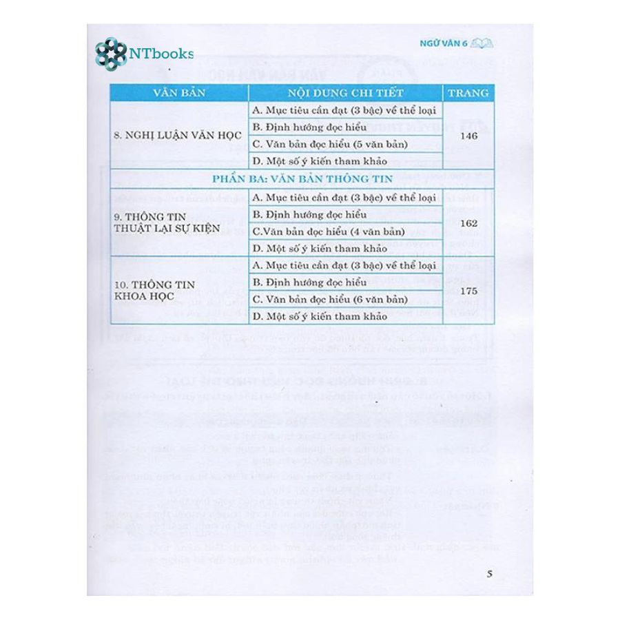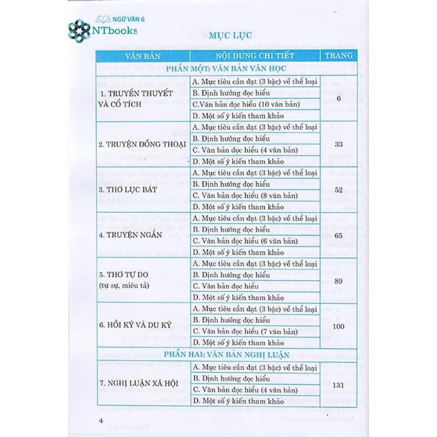 Cuốn sách gồm có 3 chương chính ứng với 3 kiểu văn bản và 10 đơn vị bài ứng với 10 thể loại (đọc hiểu) của chương trình Ngữ văn 6.