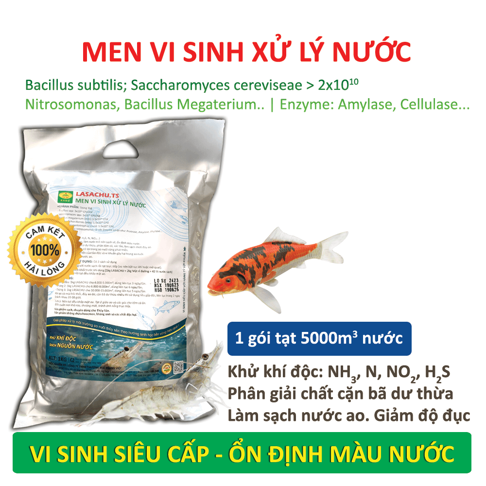 Mua tại TiktokChế phẩm sinh học xử lý môi trường ao nuôi Cá, Tôm VI SINH SIÊU CẤP ! PHÂN GIẢI ĐỘC TỐC. ỔN ĐỊNH MÀU NƯỚC ! Chế phẩm sinh học Lasachu là dòng chế phẩm xử lý môi trường ao nuôi cho Thủy sản cao cấp nhất hiện nay. Đây là đề tài nguyên cứu của các giảng viên, chuyên gia Nông nghiệp hàng đầu của Trường Đại học Nông nghiệp 1 Hà Nội. Trong Chế phẩm này có tổng hợp hàng ngàn tỷ các chủng vi khuẩn có lợi giúp phân giải các tạp chất khó tan thành dễ tan, phân giải độc tố, ổn định màu nước, cân bằng pH và bổ sung dinh dưỡng cho môi trường ao nuôi. [ 1 gói Chế phẩm xử lý tới 2000-5000m3 diện tích ao nuôi ] Thành phần:
