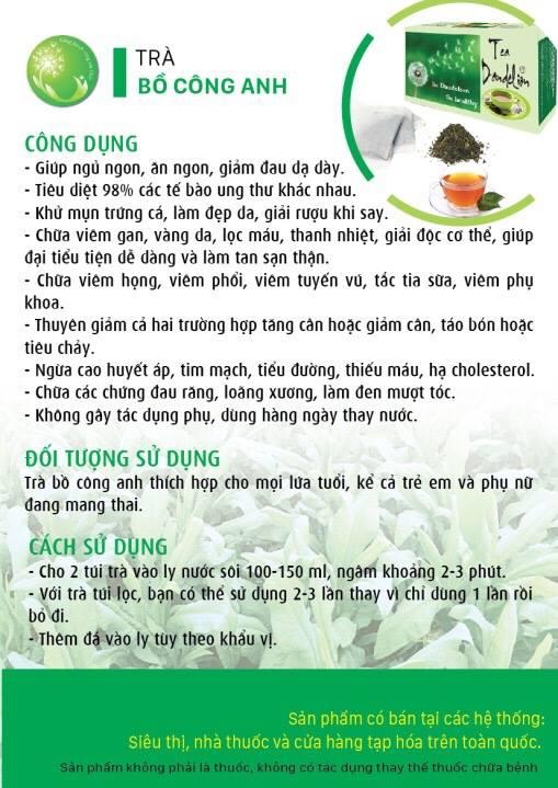 Trà túi lọc Bồ công anh được làm từ thân, lá và rễ cây bồ công anh tươi, được phơi khô sau đó đem xay nhuyễn cùng một ít lá cỏ ngọt (giúp trà có vị ngọt dịu, thơm mát) và cho vào từng túi nhỏ, với ưu điểm như vậy, trà bồ công anh mang lại sự tiện lợi cho người sử dụng và không phải lo lắng về thành phần của trà. Trong những ngày hè oi ả nóng bức như thế này, một ly trà bồ công anh sẽ mang lại cho bạn cảm giác “mát từ trong ra ngoài”, không những thế còn giúp cho hệ tiêu hóa hoạt động tốt, mát gan, lợi tiểu, đẹp da sẽ là những gì bạn sẽ cảm nhận được ngay sau khi uống Trà Bồ Công Anh.