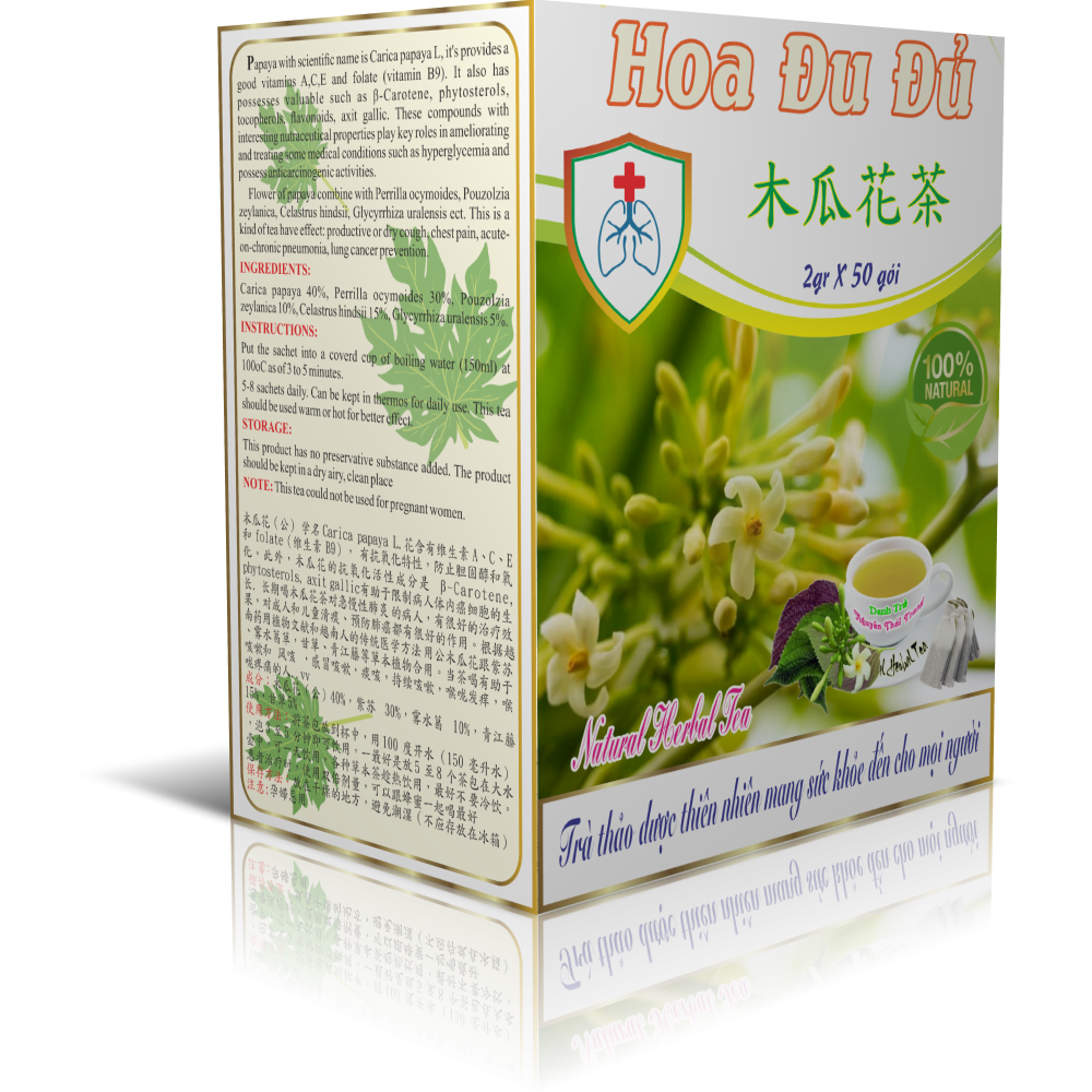 Hoa Đu Đủ (đực) có tên khoa học là Carica papaya L, Trong hoa có chứa vitamin A, C, E và folate (vitamin B9) có đặc tính chống oxy hóa, ngăn ngừa cholesterol và quá trình oxy hoá. Ngoài ra, các hoạt chất chống oxy hoá trong hoa đu đủ như β-Carotene, flavonoids, axit gallic góp phần hạn chế sự phát triển của các tế bào ung thư trong cơ thể người bệnh. Trà Hoa Đu Đủ uống lâu ngày rất tốt cho người viên phổi cấp, mãn tính, làm sạch đờm cho người lớn và trẻ nhỏ, phòng tránh ung thư phổi.