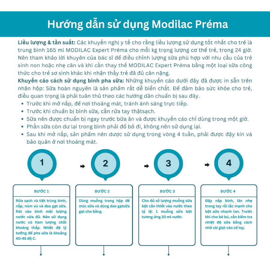 Sữa mẹ là thức ăn tốt nhất cho sức khỏe và sự phát triển toàn diện của trẻ sơ sinh và trẻ nhỏ.   Sữa bột cao cấp Modilac Expert Préma dành cho trẻ sinh non được nhập khẩu nguyên hộp từ Pháp   MODILAC EXPERT PRÉMA DÀNH RIÊNG CHO TRẺ SINH NON   • Modilac Expert Préma được nghiên cứu dựa trên công thức đặc biệt dành riêng cho trẻ sinh non và nhẹ cân. • Thành phần chất béo TCM dễ hấp thu, hàm lượng Protein lý tưởng (Protein hòa tan 60% và Casein 40%), và bổ sung DHA cùng các dưỡng chất cần cho sự phát triển trí não của trẻ sinh non   6 YÊN TÂM KHI MẸ CHỌN MODILAC SỮA NỘI ĐỊA PHÁP  • Modilac là dòng sữa nội địa cao cấp tại Pháp. • Đầy đủ chứng nhận ISO 9001 & ISO 22000. • Là một trong ít nhãn sữa có viện nghiên cứu riêng. • Mỗi lon sữa Modilac đều được cải tiến không ngừng, phù hợp với sự phát triển của bé. • Trải qua hơn 800 lần xét nghiệm, hơn 200 lượt kiểm tra trước khi đưa ra thị trường. • Là dòng sữa công thức sản xuất bởi tập đoàn Savencia với hơn 60 xây dựng và phát triển. • Modilac Expert Préma là sản phẩm của Tập đoàn Savencia, top 1 về sản xuất bơ sữa tại Pháp, top 5 về sản xuất bơ sữa toàn cầu. Các sản phẩm của Savencia có mặt tại 120 quốc gia.    HƯỚNG DẪN SỬ DỤNG   Lưu ý: Xuất xứ: Pháp Hạn sử dụng: 24 tháng Bảo quản sữa bột Modilac ở nơi thoáng mát, khô ráo trước và sau khi mở. Sau khi mở, đóng nắp thật chặt. Sử dụng trong vòng 1 tháng kể từ lần mở hộp đầu tiên.