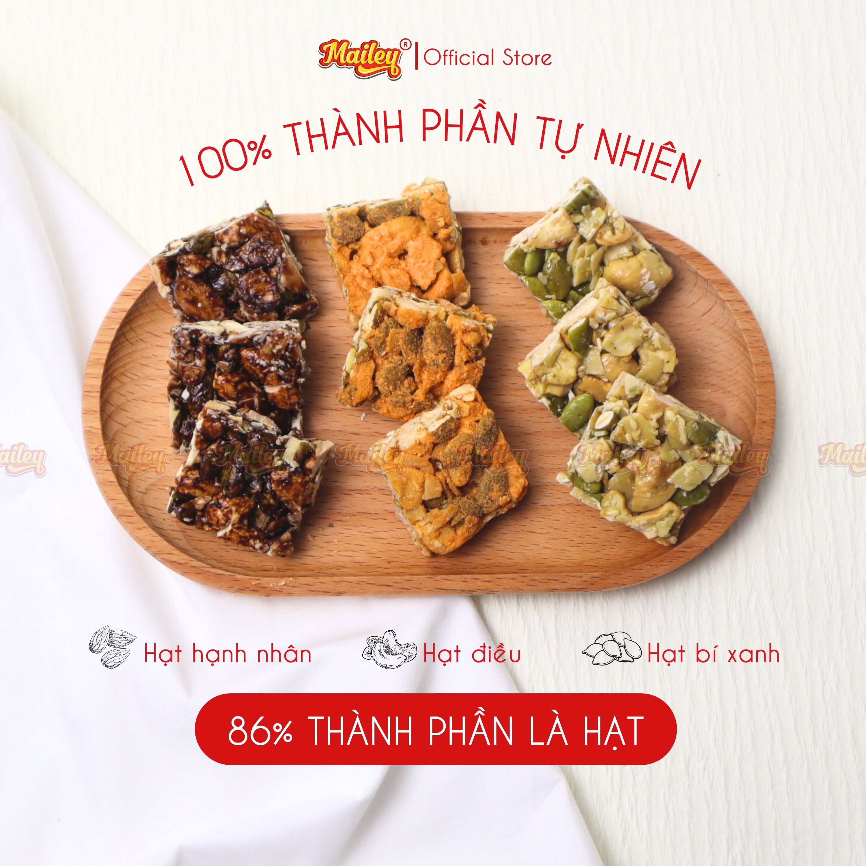 Bạn có thể ăn vặt mỗi ngày mà không cần lo lắng – vì bánh hạt Mailey được làm từ 100% thành phần tự nhiên, không đường tinh luyện, không chất bảo quản, không chiên dầu và chỉ ngọt nhẹ từ nguyên liệu tự nhiên.
