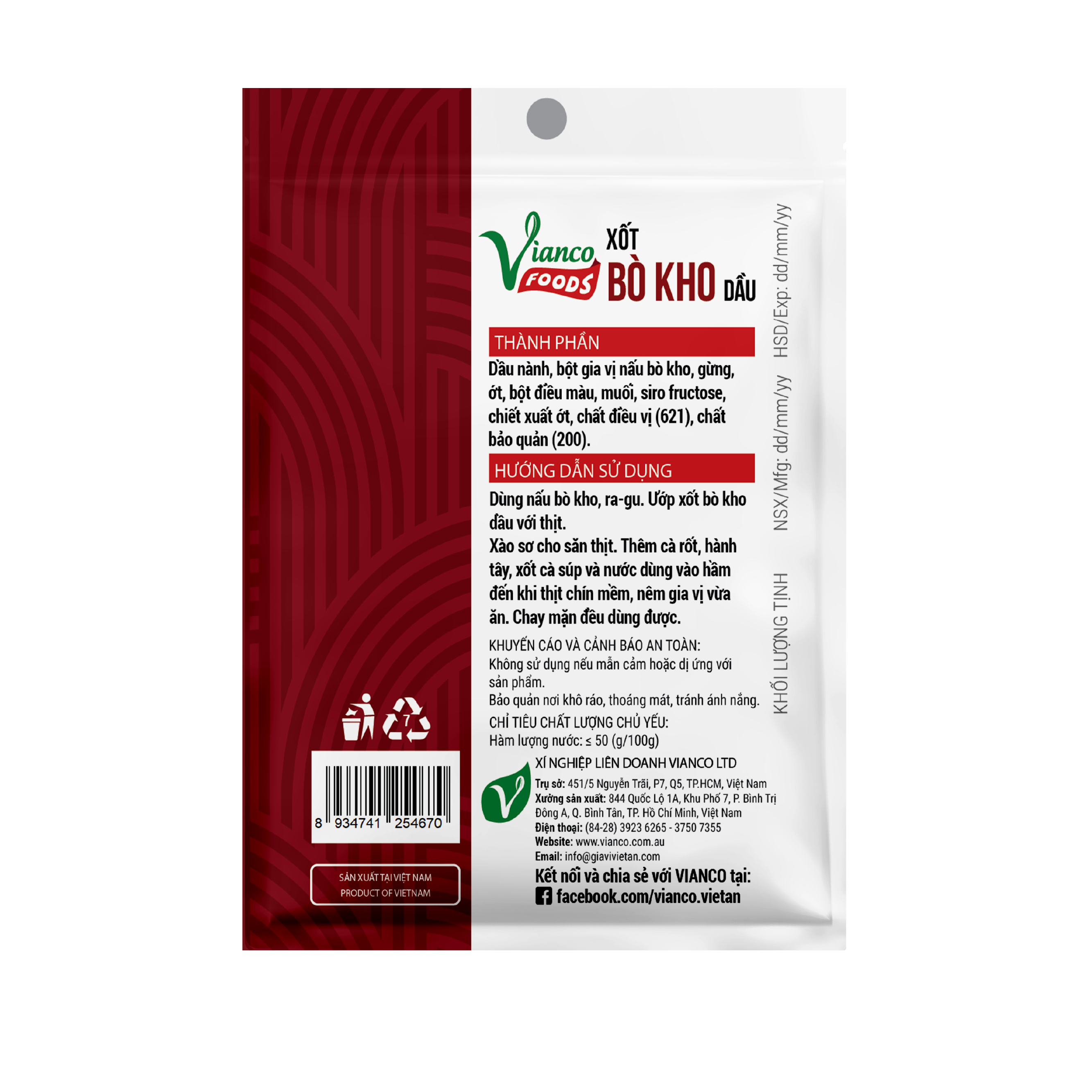 Xốt bò kho dầu Vianco dùng để nấu các món bò kho theo kiểu thức mới, rút gọn thời gian nấu thực tế của người nấu ăn. Xốt bò kho dầu Vianco bao gồm: Dầu nành, bột bò kho, gừng, khoai tây, tỏi, ớt, khoai lang, bột điều màu, siro fructose, muối.