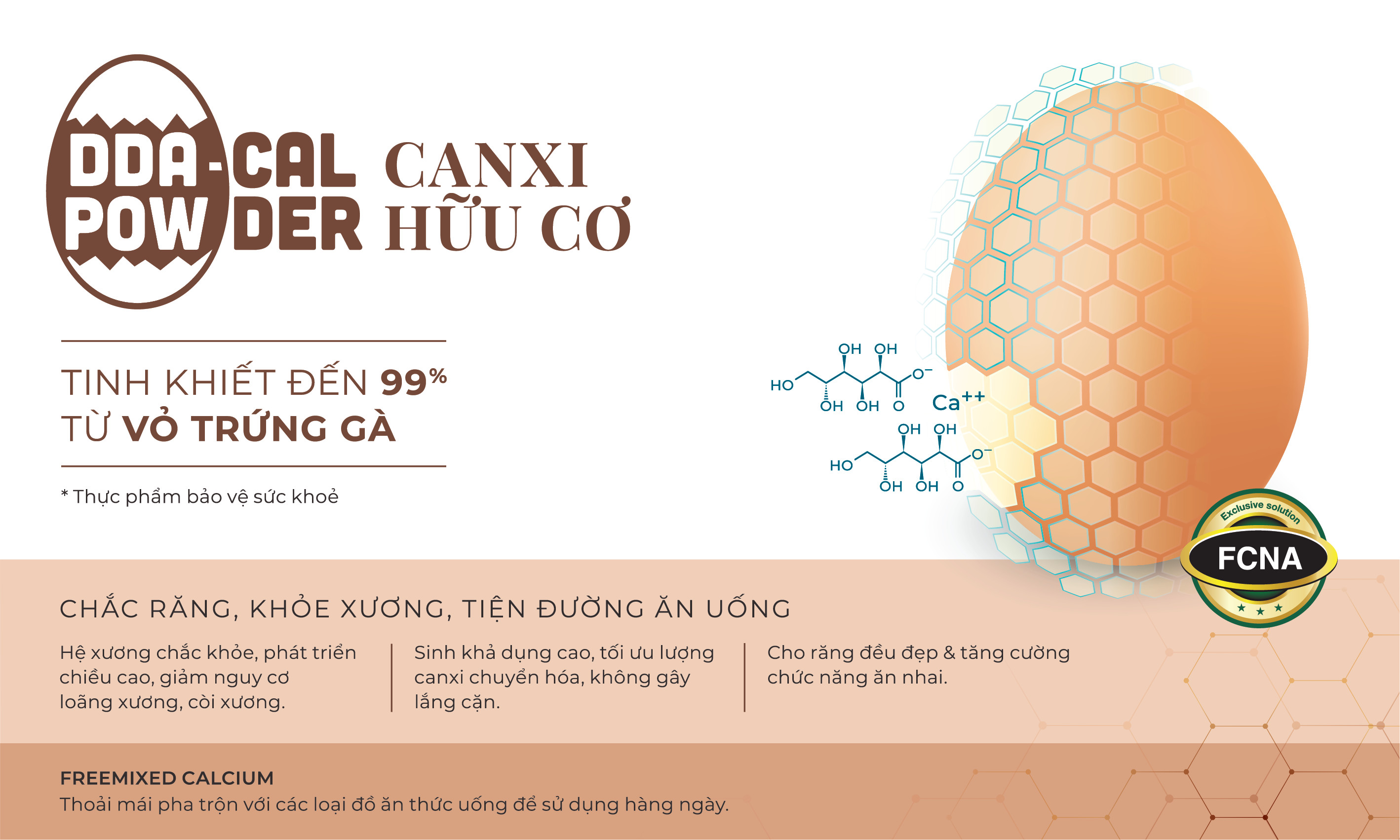 Thực phẩm chức năng canxi hữu cơ DDA chiết xuất từ vỏ trứng gà tinh khiết 99.9% dạng bột hoà tan nhanh, hỗ trợ giúp hệ xương chắc khoẻ, giảm loãng xương, còi xương, tăng chiều cao và các bệnh lý thiếu canxi, hỗ trợ mọc răng sớm, cho răng chắc & đều đẹp, tăng cường chức năng ăn nhai. Với nguồn canxi hữu cơ gốc gluconate thân thiện với hệ tiêu hoá, hấp thu tối đa lượng canxi, sản phẩm bảo vệ và hỗ trợ tối ưu cho quá trình tăng trưởng thể chất của bé và gia đình. Sản phẩm thích hợp cho bé từ 1 tuổi trở lên đến người lớn tuổi.