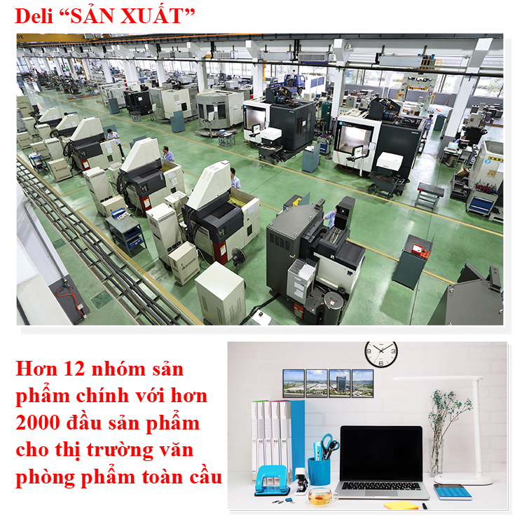 Dẫn đầu về sản xuất: Là nhà sản xuất Văn Phòng Phẩm lớn nhất Châu Á, sức mạnh về sản xuất của Deli luôn đảm bảo sức mạnh sản xuất ổn định.