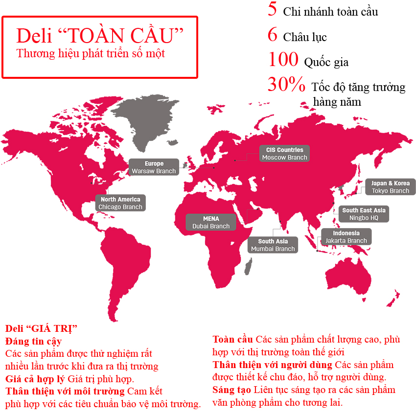 Hiện diện toàn cầu: Các sản phẩm Deli được bán ở hơn 100 Quốc gia, có mặt ở cả 6 Châu lục cùng với 5 chi nhánh bán hàng toàn cầu.