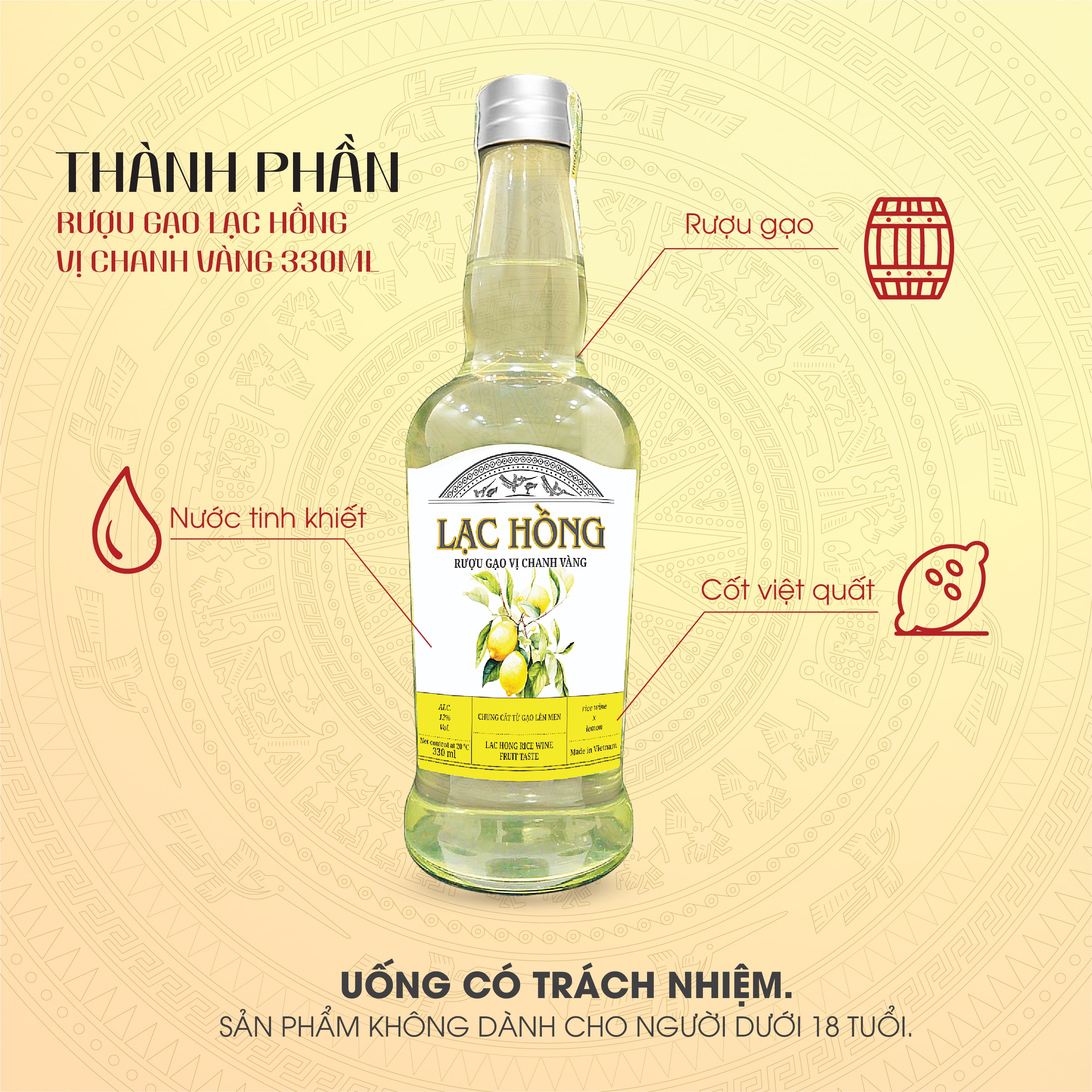 Rượu gạo Lạc Hồng vị Chanh Vàng (12%) Rượu gạo Lạc Hồng vị Chanh Vàng mang đến hương vị chua nhẹ thanh mát từ chanh vàng, kết hợp cùng rượu gạo Việt Nam. Với nồng