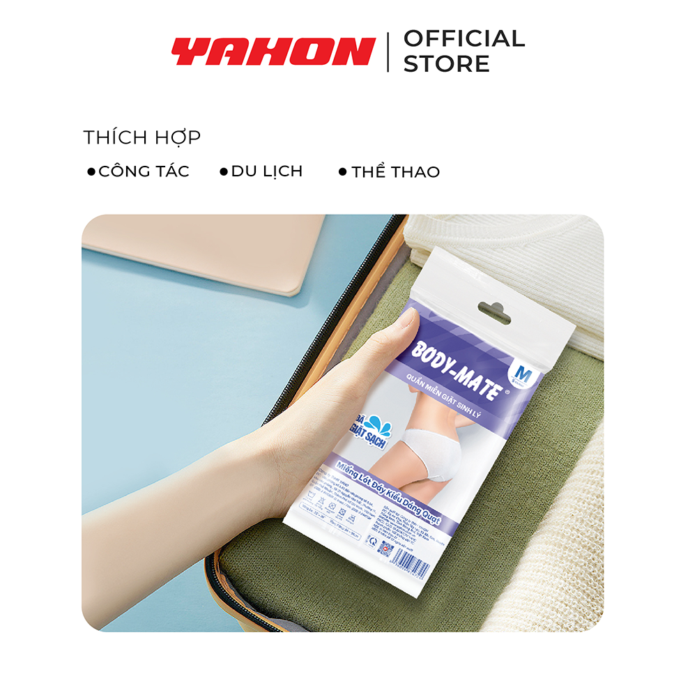 Mua tại TiktokQUẦN LÓT MIỄN GIẶT SINH LÝ BODY-MATE NỮ Chất liệu TC mềm mại, thấm hút, thoáng khí và vô cùng thoải mái khi mặc. Thiết kế 3D vừa vặn, ôm sát vòng mông với 02 miếng lót dày, mềm, thấm hút. Sản phẩm đã được giặt sạch, sấy khô trước khi đóng gói và tái sử dụng sau khi mặc. Có thể sử dụng ngay khi mở gói. Vô cùng vệ sinh, tiện lợi. Thành phần: Vải TC Quy cách: Size M: Vòng mông 84 - 94 cm; 5 cái/bao, 72 bao/thùng Size L: Vòng mông 92 - 100 cm; 5 cái/bao, 72 bao/thùng Size XL: Vòng mông 100 - 115 cm; 5 cái/bao, 72 bao/thùng Hạn sử dụng: 3 năm NSX: in trên bao bì