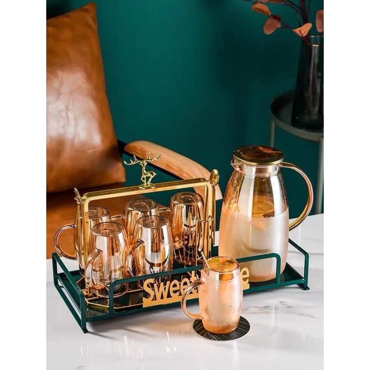 ✨Combo bình đựng nước uống thủy tinh chịu nhiệt cao cấp kèm khay và giá úp cốc