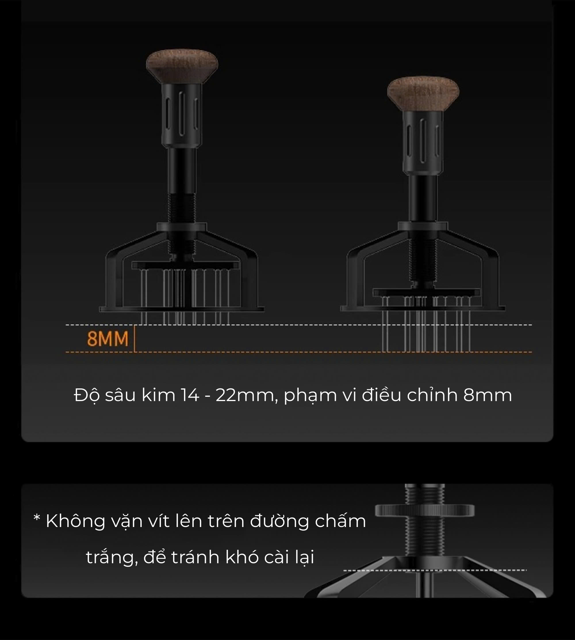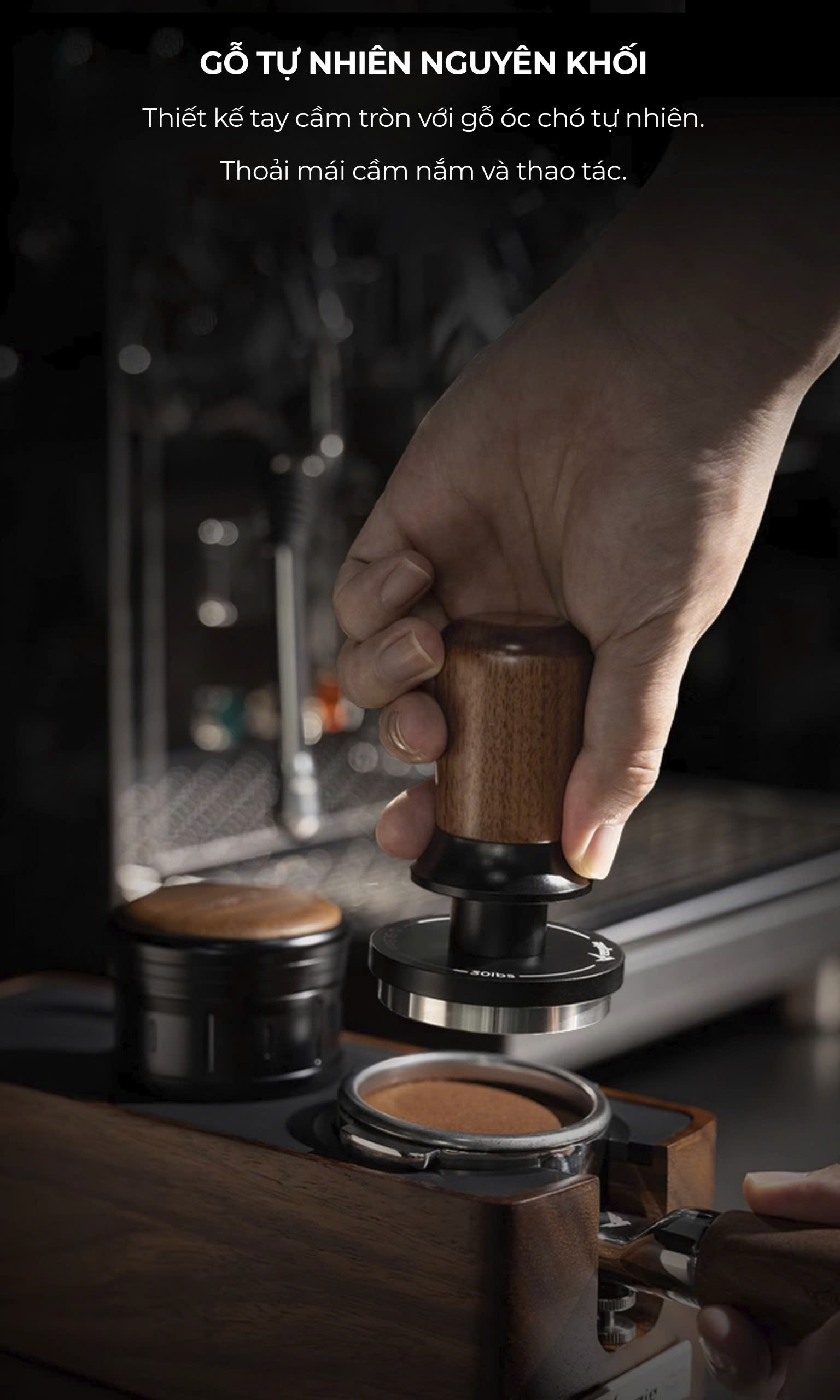 BỘ SẢN PHẨM GỒM Tamper Nén Cố Định Lực Cân Bằng ️ Lực nén 30 lbs ổn định, đảm bảo áp suất đồng đều, hạn chế kênh nước. ️ Phản hồi âm thanh "Click", giúp nhận biết khi đạt lực nén chuẩn. ️ Ba lò xo trợ lực, thao tác dễ dàng, hạn chế rung lắc. ️ Đế inox 304 + tay cầm gỗ óc chó, bền bỉ, sang trọng. Dosing Hứng Đong Cà Phê ️ Giữ bột cà phê không rơi vãi, giúp quầy pha chế luôn sạch sẽ. ️ Thiết kế nắp gỗ óc chó cao cấp, sang trọng và bền bỉ. ️ Chất liệu hợp kim nhôm anodized, chống bám bẩn, dễ vệ sinh. ️ Đường kính 58.5mm, khớp hoàn hảo với giỏ lọc espresso. Kim Xoay Tán Đều Bột ️ 14 kim inox 304 siêu mảnh, giúp phá vỡ khối bột, hạn chế kênh rãnh. ️ Cơ chế xoắn ốc tự động xoay, giúp phân bố bột đồng đều. ️ Tay cầm gỗ + thân hợp kim nhôm, bền bỉ, thao tác dễ dàng. ️ Tương thích tay cầm 58mm, phù hợp với mọi setup barista. OCD San Phẳng Bề Mặt Cà Phê ️ San phẳng bề mặt bột nhanh chóng, đảm bảo nước chảy đều. ️ Điều chỉnh độ sâu vô cấp, linh hoạt cho từng loại cà phê. ️ Tay cầm gỗ óc chó + đế inox 304 chống gỉ sét, thẩm mỹ & bền bỉ. ️ Đường kính 58.5mm, phù hợp giỏ lọc espresso chuyên nghiệp.