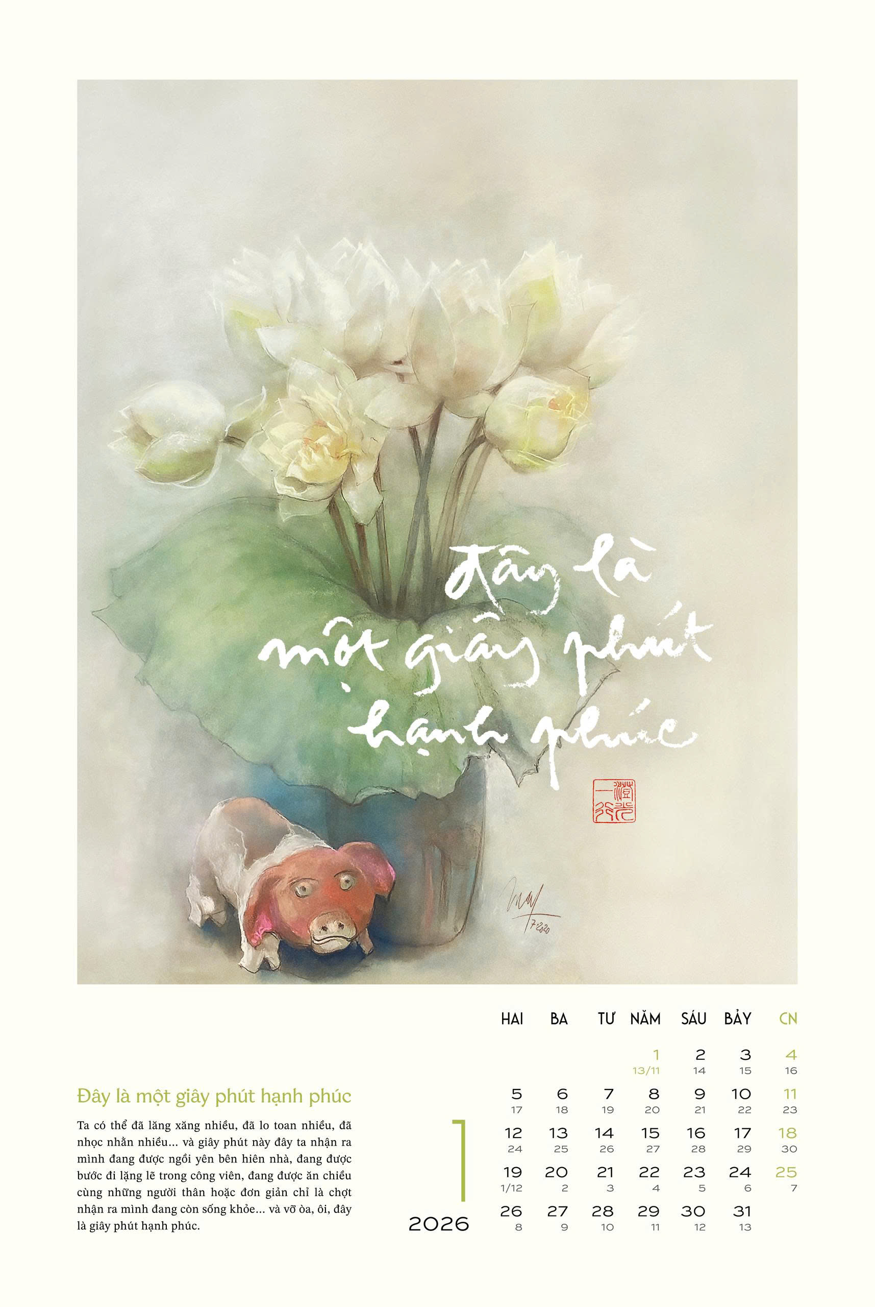 Bộ lịch gồm 12 thông điệp thư pháp nhẹ nhàng, sâu sắc từ Thiền sư Thích Nhất Hạnh như: Thở đi con, thở thật sâu thật chậm, không sao đâu; Lắng nghe; Con về nương tựa đất Mẹ; Lòng hôm ấy sẽ là lòng muôn thuở; Đây là một giây phút hạnh phúc…kết hợp cùng tranh hoa sen của hoạ sĩ Trịnh Lữ – biểu tượng của giác ngộ và thanh tịnh, nở lên từ lòng đất, như nhắc ta: hạnh phúc và hiểu biết có thể bắt đầu từ chính nơi ta đang đứng.