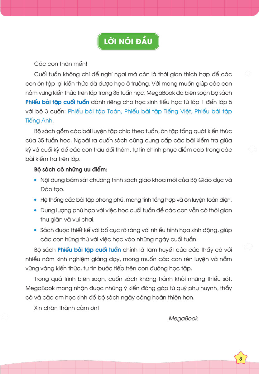 - Phiếu Bài Tập Cuối Tuần Tiếng Anh 1 (35 Tuần Học) Cuối tuần không chỉ để nghỉ ngơi mà còn là thời gian thích hợp ôn tập lại kiến thức đã được học ở trường. Với mong muốn giúp các con nắm vững kiến thức trên lớp trong 35 tuần học, Phiếu Bài Tập Cuối Tuần đã được biên soạn dành riêng cho học sinh tiểu học từ lớp 1 đến lớp 5 nằm trong bộ 3 cuốn: Phiếu bài tập cuối tuần Tiếng Việt, Phiếu bài tập cuối tuần Toán, Phiếu bài tập cuối tuần Tiếng Anh. Combo Phiếu Bài Tập Cuối Tuần Toán, Tiếng Việt, Tiếng Anh Lớp 1 gồm các bài luyện tập chia theo tuần, ôn tập tổng quát kiến thức của 35 tuần học. Ngoài ra cuốn sách cũng cung cấp các bài kiểm tra giữa kỳ và cuối kỳ để các con trau dồi thêm, tự tin chinh phục điểm cao trong các bài kiểm tra trên lớp. Combo Phiếu Bài Tập Cuối Tuần Toán, Tiếng Việt, Tiếng Anh Lớp 1 có những ưu điểm như sau: