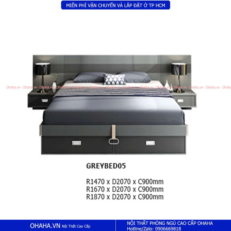 - 01 giường có kích R140 x D200cm (lọt nệm), R147 x D207cm (phủ bì) x C90cm