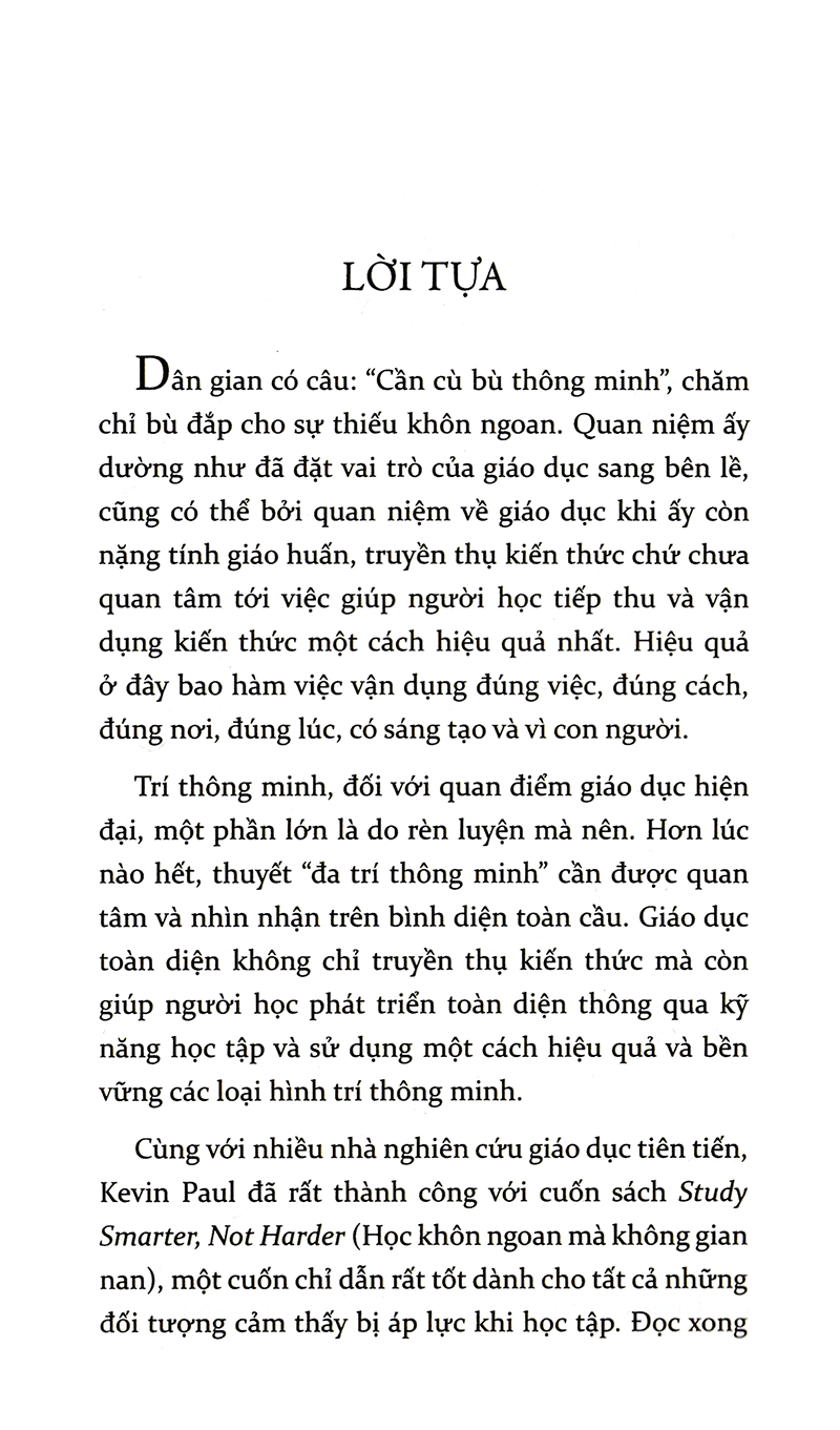 • Dân gian có câu: "Cần cù bù thông minh", chăm chỉ bù đắp cho sự thiếu khôn ngoan. Quan niệm ấy dường như đã đặt vai trò của giáo dục sang bên lề, cũng có thể bởi quan niệm về giáo dục khi ấy còn nặng tính giáo huấn, truyền thụ kiến thức chứ chưa quan tâm tới việc giúp người học tiếp thu và vận dụng kiến thức một cách hiệu quả nhất. Hiệu quả ở đây bao hàm việc vận dụng đúng việc, đúng cách, đúng nơi, đúng lúc, có sáng tạo và vì con người. Cùng với nhiều nhà nghiên cứu giáo dục tiên tiến, Kevin Paul đã rất thành công với cuốn sách Study Smarter, Not Harder (Học khôn ngoan mà không gian nan), một cuốn chỉ dẫn rất tốt dành cho tất cả những đối tượng cảm thấy có áp lực trong học tập. Đọc xong cuốn sách, có lẽ lúc đó nhiều người mới thật sự hiểu thế nào là học tập. Cuốn sách giúp người đọc − người học − tìm được đúng cách thức học tập tùy theo nội dung và thời điểm, và khám phá những loại hình trí thông minh của chính mình.