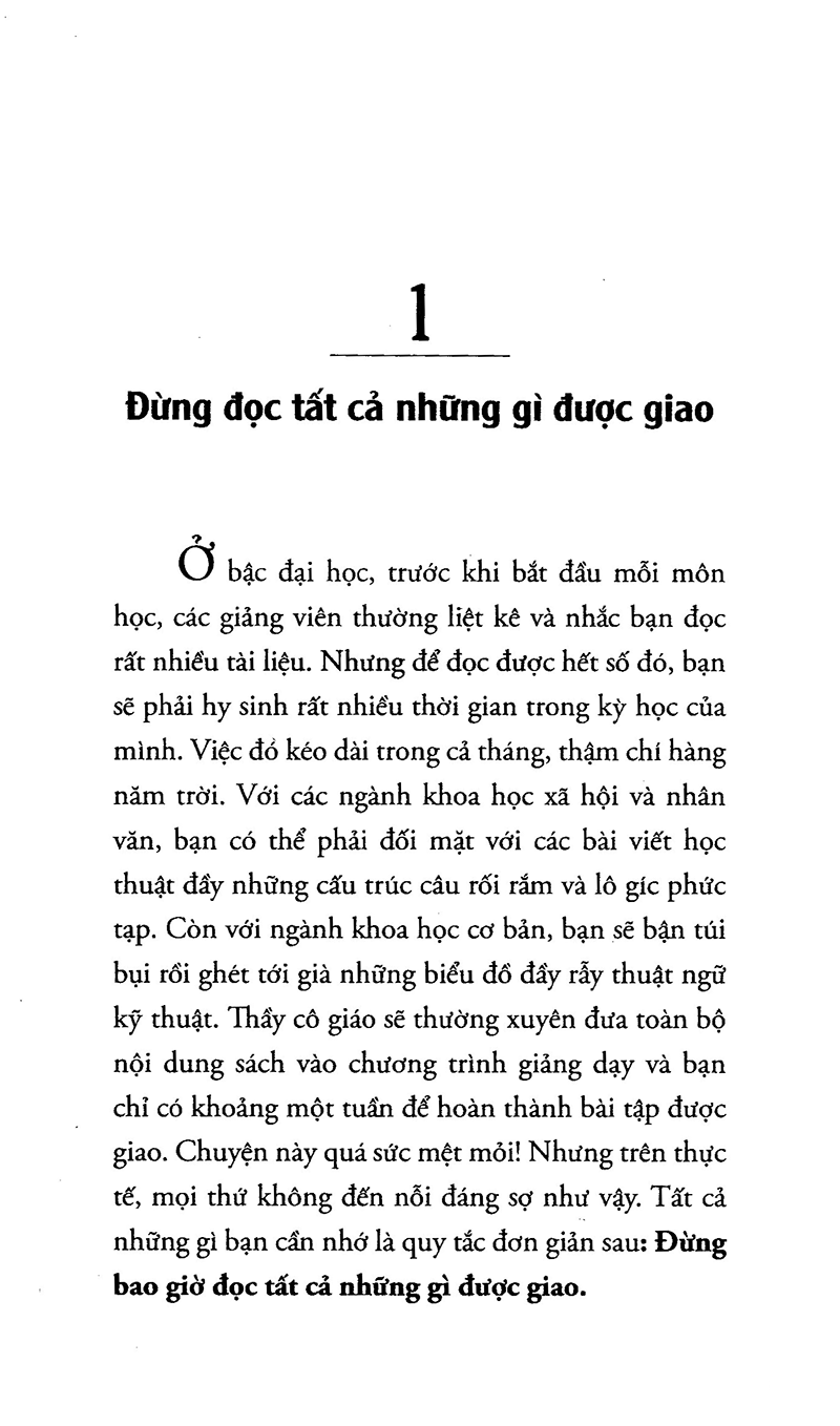 Mọi công việc đều có những quy trình bảo đảm tính hệ thống và kết quả của công việc. Học tập cũng vậy. Kevin Paul giúp cho độc giả thấy được tầm quan trọng của bước chuẩn bị cũng như của việc xác định mục tiêu học tập. Tác giả cũng cung cấp những kỹ năng cần thiết cho việc tạo động lực học tập, ghi chép, ghi nhớ, liên hệ vận dụng và khả năng tập trung.