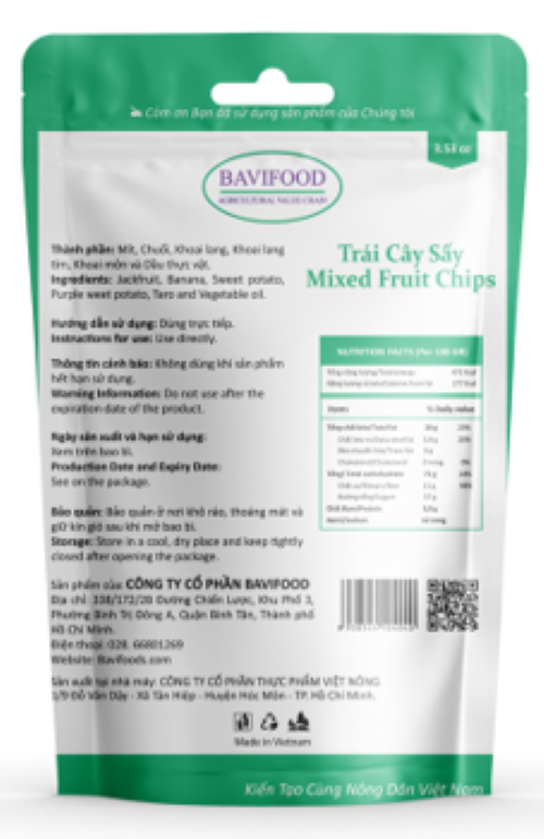 Mua tại TiktokMÔ TẢ SẢN PHẨM Tên sản phẩm: Trái cây sấy chân không - BAVI. Thương hiệu: BAVIFOOD Dòng sản phẩm: Cao cấp - Premium. Phương pháp sấy: Sấy chân không. Thành phần: Mít chín, Chuối chín, Khoai lang vàng, Khoai lang tím, Khoai môn và Dầu thực vật. Đặc tính: Sản phẩm giòn xốp mà vẫn giữ được hương vị thơm ngon, vị ngọt thanh tự nhiên …, màu sắc tươi nguyên và bảo toàn được giá trị dinh dưỡng. Đóng gói: