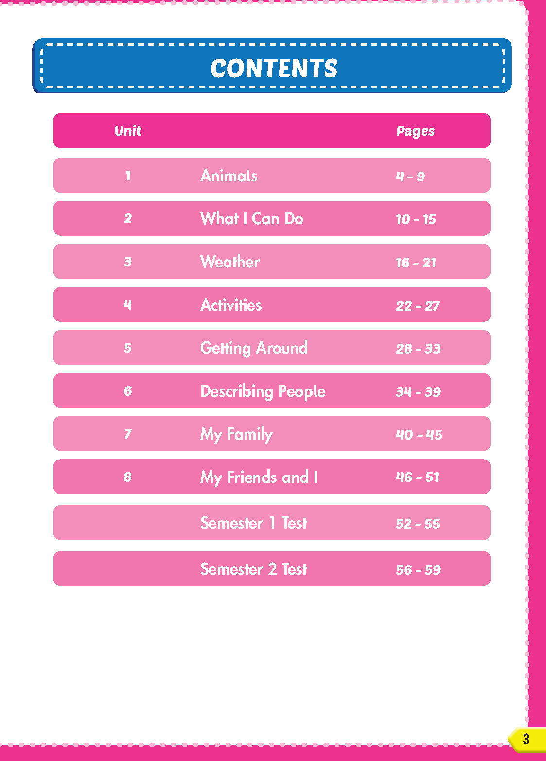 Sách : Learning English - Tiếng Anh Lớp 2 & Lớp 3 (7 - 9 Tuổi ) Nội Dung : - Bảng mục lục: Chỉ rõ các mục tiêu chính và trọng tâm của mỗi
