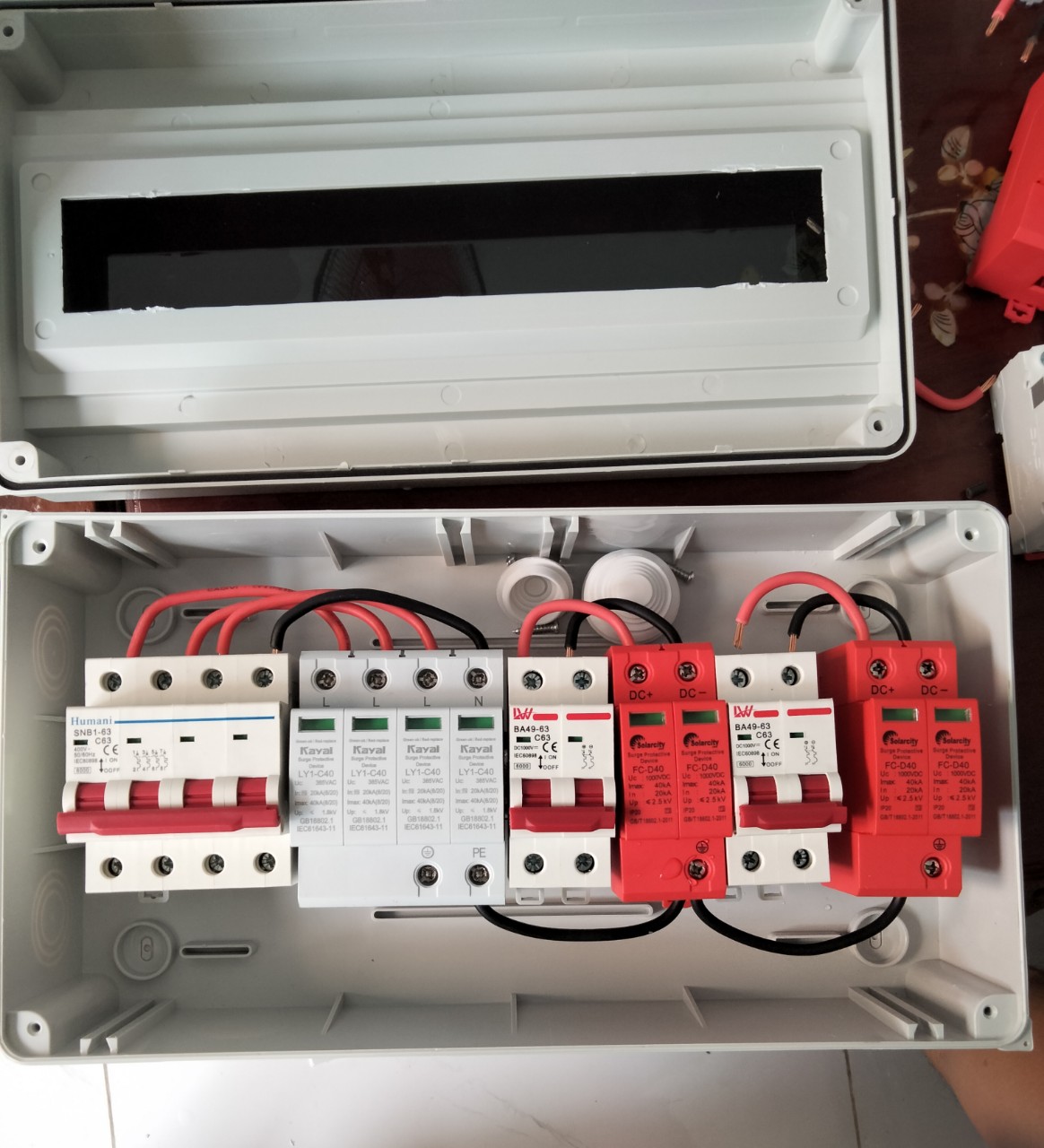 Tủ điện hòa lưới năng lượng mặt trời lắp sẵn dùng cho hệ thống 3KW-20KW sử dụng diện lưới 1 pha + 1 string: - 1 CB DC 1000VDC - 1 CB AC 220V 32A