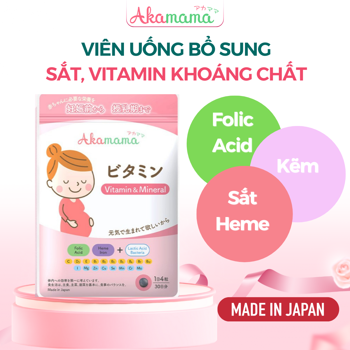 4. Viên Uống Bổ Sung Sắt, Acid Folic, Vitamin Tổng Hợp, Khoáng Chất Cho Mẹ Bầu, Hỗ Trợ Tiêu Hoá, Hạn Chế Rạn Da, Viên Nhỏ, Không Mùi, Vị, Dễ Uống, Akamama Nhật Bản Túi 120 Viên