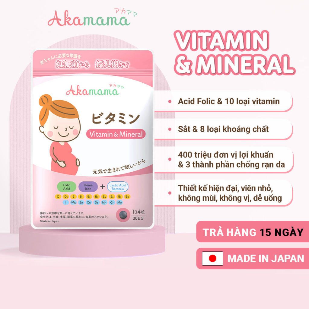 - Viên Uống Bổ Sung Sắt, Acid Folic, Vitamin Tổng Hợp, Khoáng Chất Cho Mẹ Bầu, Hỗ Trợ Tiêu Hoá, Hạn Chế Rạn Da, Viên Nhỏ, Không Mùi, Vị, Dễ Uống, Akamama Nhật Bản Túi 120 Viên ƯU ĐIỂM CỦA SẢN PHẨM SẮT & VITAMIN TỔNG HỢP CHO BÀ BẦU AKAMAMA, NHẬT BẢN: