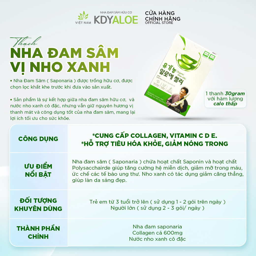 Mua tại TiktokTHẠCH NHA ĐAM SÂM NHO XANH KDY ALOE HỖ TRỢ TIÊU HÓA - COMBO x3 THÔNG TIN CHUNG ️ Thương hiệu: KDY Aloe ️ Xuất xứ: Hàn Quốc ️ Quy cách: 10 gói/ hộp ️ Dung tích: 30g/ gói ️ Dạng: Collagen ăn liền dạng thạch ️ Thời hạn sử dụng: 24 tháng kể từ ngày sản xuất. Thời hạn sử dụng được ghi rõ trên bao bì sản phẩm Công Dụng Thạch Nha Đam Vị Nho Xanh ️ Bổ sung collagen, Tăng cường miễn dịch, Hỗ trợ điều trị táo bón , Bổ sung vitamin C,E, chống lão hóa Thành Phần Chính ️ Nha đam Saponaria Hàn Quốc, Nước nho xanh cô đặc ( Thổ Nhĩ Kỳ ), Collagen cá ( Canada) ️ Các thành phần bổ trợ khác Lưu ý: Sản phẩm này không phải là thuốc và không thể thay thế thuốc chữa bệnh. CAM KẾT ️ Cam kết đổi trả sản phẩm miễn phí nếu sản phẩm bị lỗi trong vòng 24h (sản phẩm lỗi phải có minh chứng bằng video được quay lại từ thời điểm mở hàng) ️ Giao hàng nhanh chóng ️ Hỗ trợ tư vấn cách sử dụng