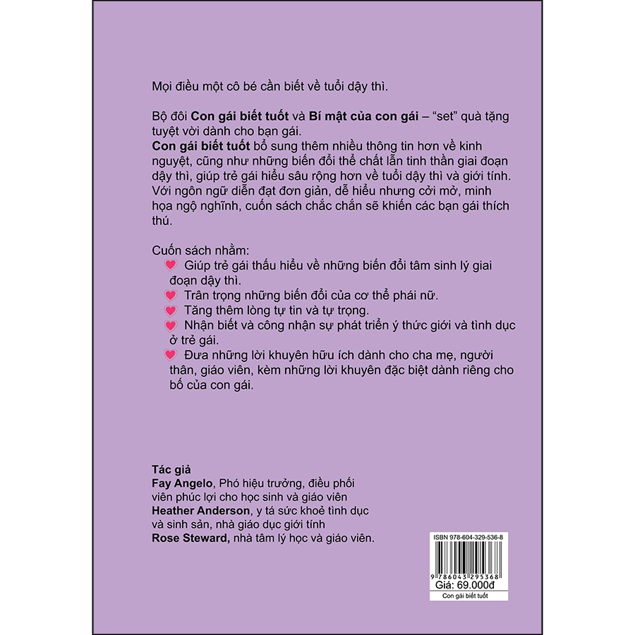 Con gái biết tuốt, một món quà tặng ý nghĩa và cực chất về dậy thì từ A-Z dành cho các bạn “chớm teen” và teen trai - gái. Cuốn sách nằm trong bộ sách giáo dục giới tính được Nhà xuất bản Phụ nữ mua bản quyền của Úc sẽ giúp các em có sự chuẩn bị thích ứng tốt nhất trong giai đoạn biến đổi tâm sinh lý tuổi dậy thì đầy lạ lẫm, tưởng phức tạp mà đơn giản, nhẹ nhàng ai cũng phải trải qua.