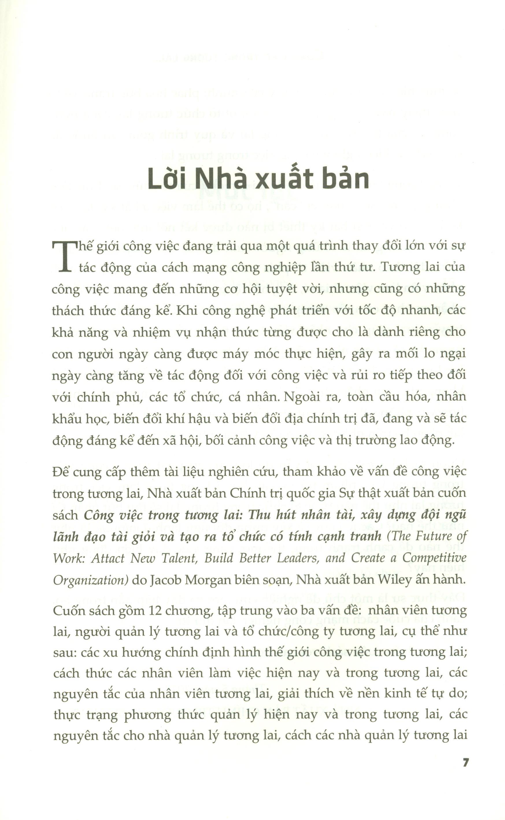 Lời khen dành tặng cuốn sách “Công việc trong tương lai” “Không có sự che giấu trong cuốn sách Công việc trong tương lai. Jacob chỉ ra chính xác cách các tổ chức phải thích nghi để tiến về phía trước, đồng thời truyền cảm hứng cho nhân viên và ác nhà quản lý để làm hết sức mình”.