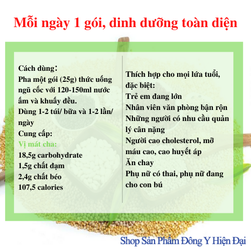Thành phần: Bột ngũ cốc tổng hợp, bột chiết xuất yến mạch, xơ hòa tan, matcha, bột yến mạch ăn liền, bột psyllium, protein đậu nành, lecithin, Tricalcium Phosphate, bột cỏ lúa mạch, chiết xuất sơ ri, Vanillin, trùng thảo, chiết xuất linh chi, non-dairy creamer, Fructose, Bột hương sữa.