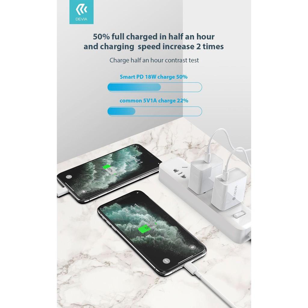 Từ đời iPhone 8 trở lên đã được Apple hỗ trợ sạc nhanh. Tuy nhiên củ sạc và cáp khi mua theo máy lại không hỗ trợ tính năng này. Với bộ sạc PD của Devia, tốc độ sạc iPhone X là từ 0 lên 50% chỉ sau 30 phút, kết quả tương tự cũng dành cho iPhone 8 và iPhone 8 Plus thì lâu hơn một chút. Như vậy là chỉ cần nửa giờ, bạn đã có thể sạc được lượng pin dùng được cho cả ngày.
