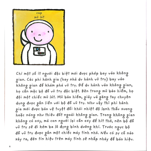 Hình ảnh sinh động, màu sắc tươi tắn: Những bức tranh minh họa trong sách chắc chắn sẽ thu hút sự chú ý của bé, giúp bé hình dung rõ hơn về quá trình một phi hành gia lên vũ trụ.
