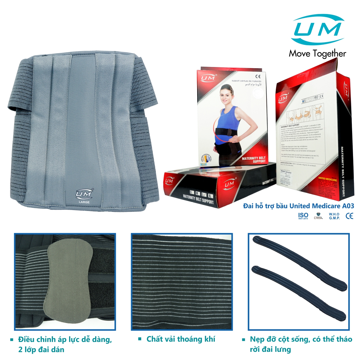 Đai hỗ trợ bầu UM (A13) là đai lưng có thiết kế đặc biệt hỗ trợ phần lưng thấp ở khung chậu và đau phần Sacro-Iliac ở phụ nữ mang thai. Đai hỗ trợ bầu UM có tác dụng nâng đỡ phần bụng và em bé trong bụng, giảm bớt gánh nặng trên thắt lưng cho người mẹ khi mang thai. CHỈ ĐỊNH