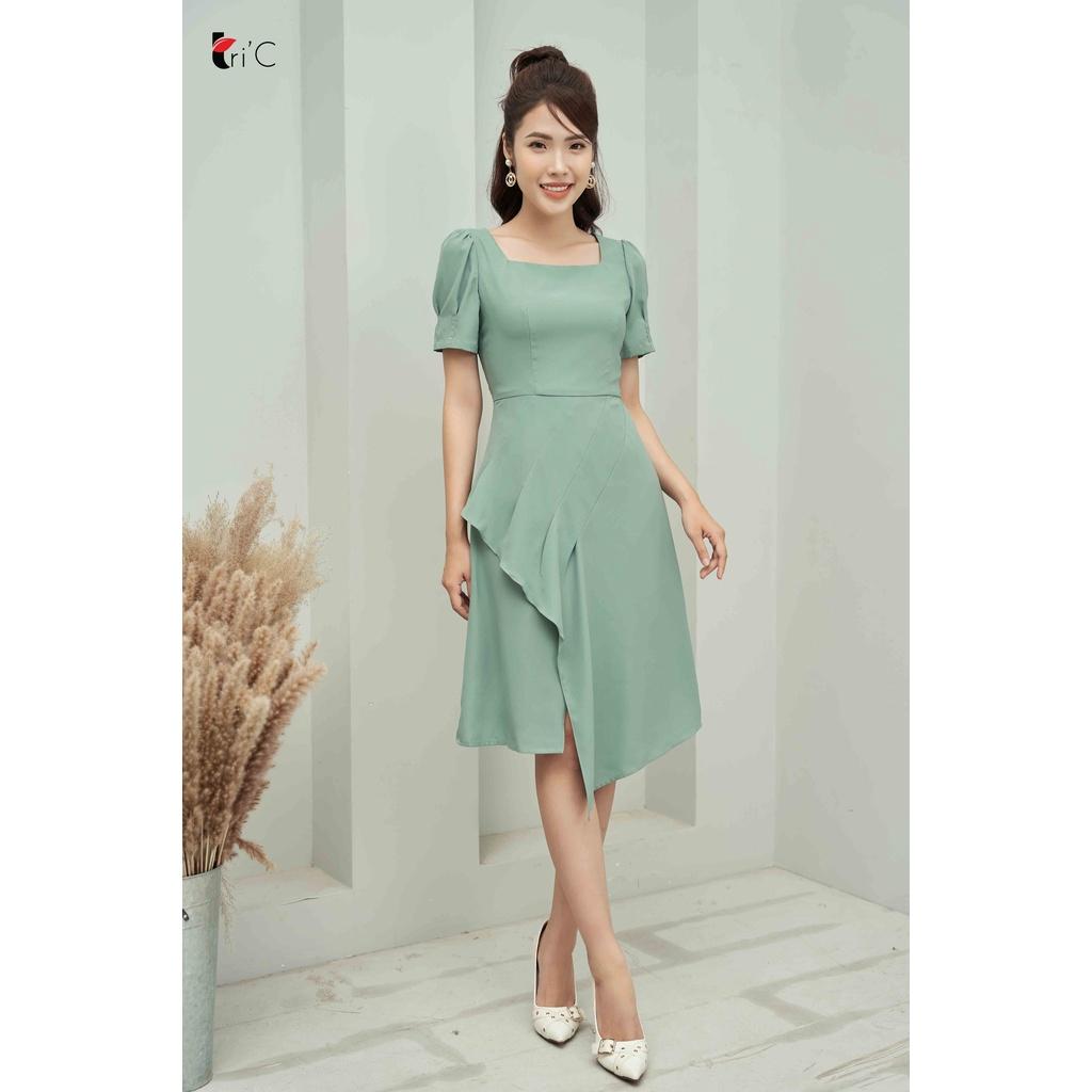 ✨Đầm A cổ vuông, tay bồng, bèo lệch Tri'C Luxury A22621 Xanh mint