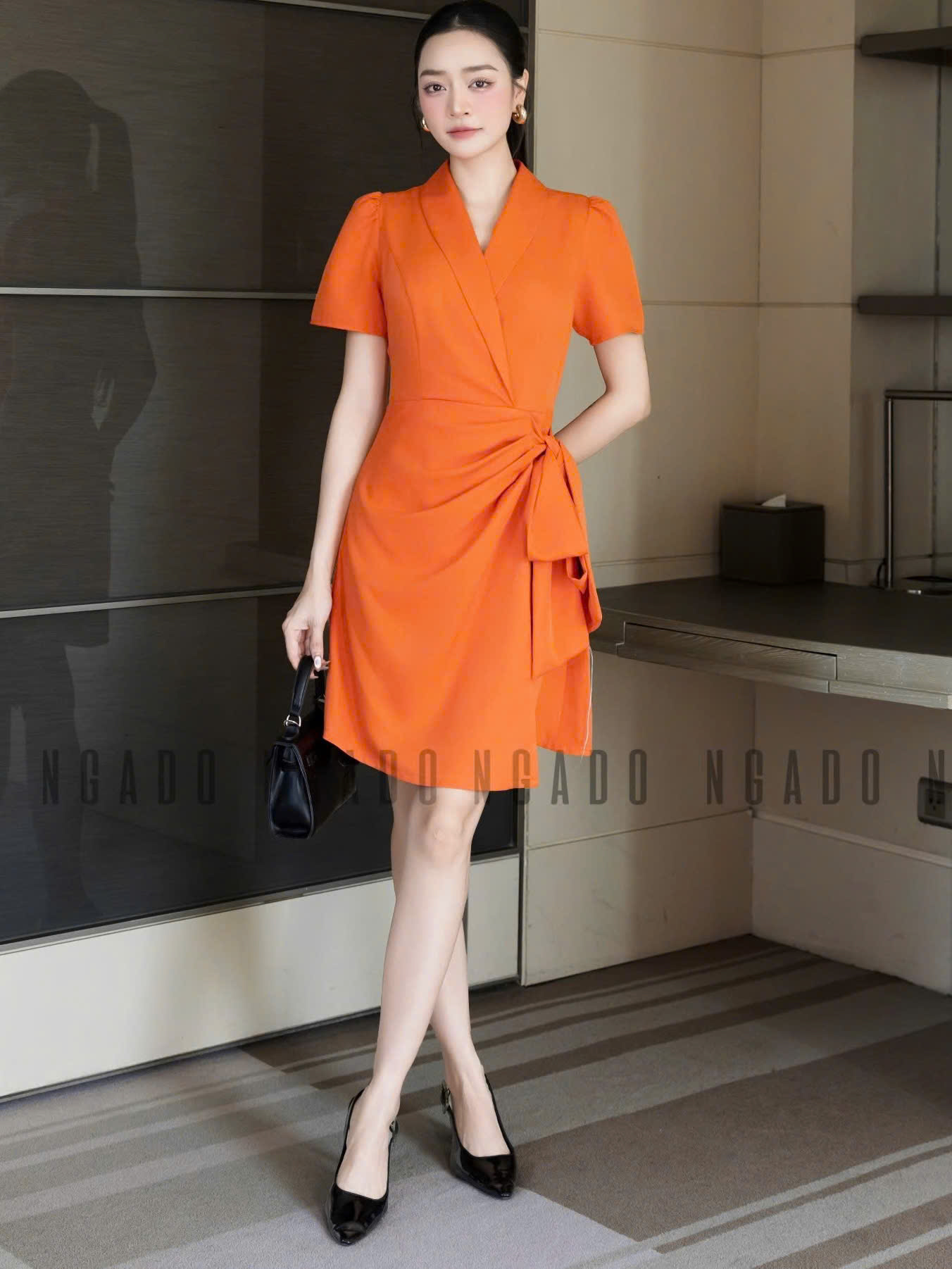 ✨Đầm cam vạt xếp NGADO , đầm ngắn , đầm thiết kế Nữ