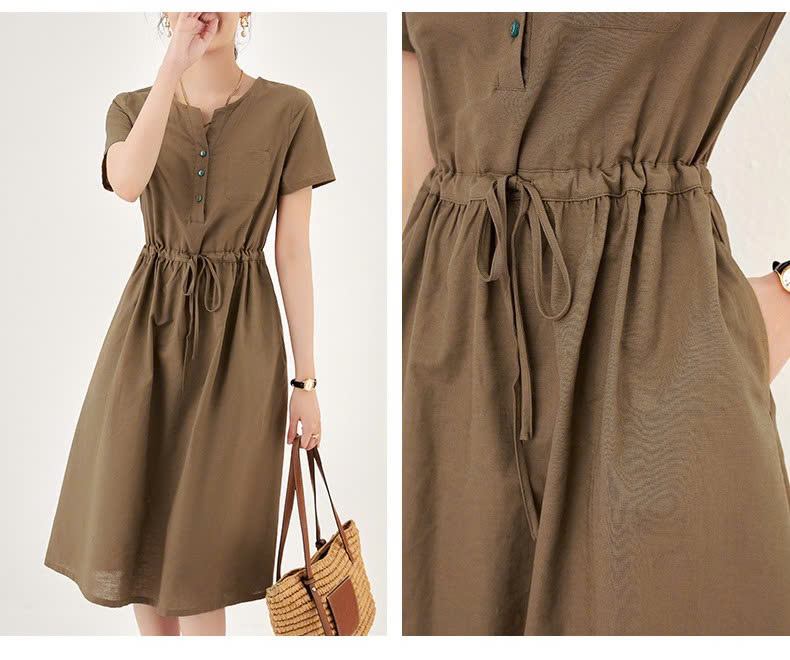 ✨Đầm cao cấp Đũi Việt thiết kệ cổ V và dây rút sang trọng, trẻ trung da218