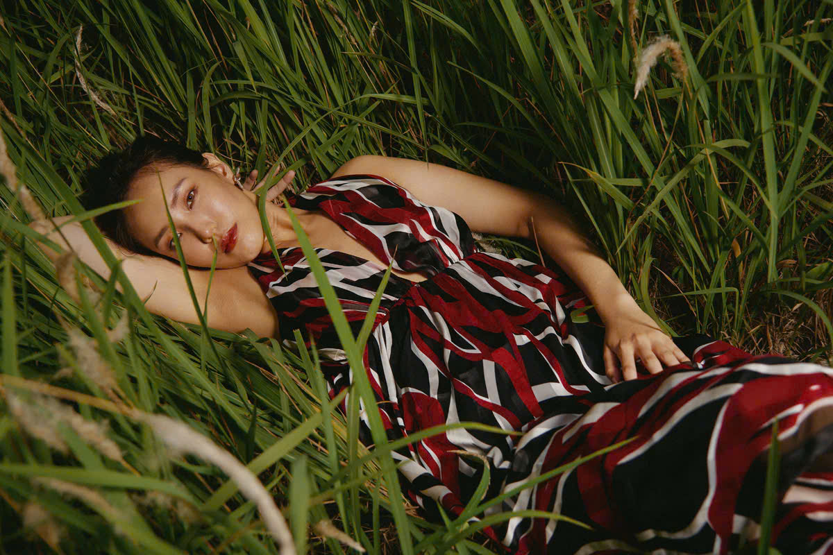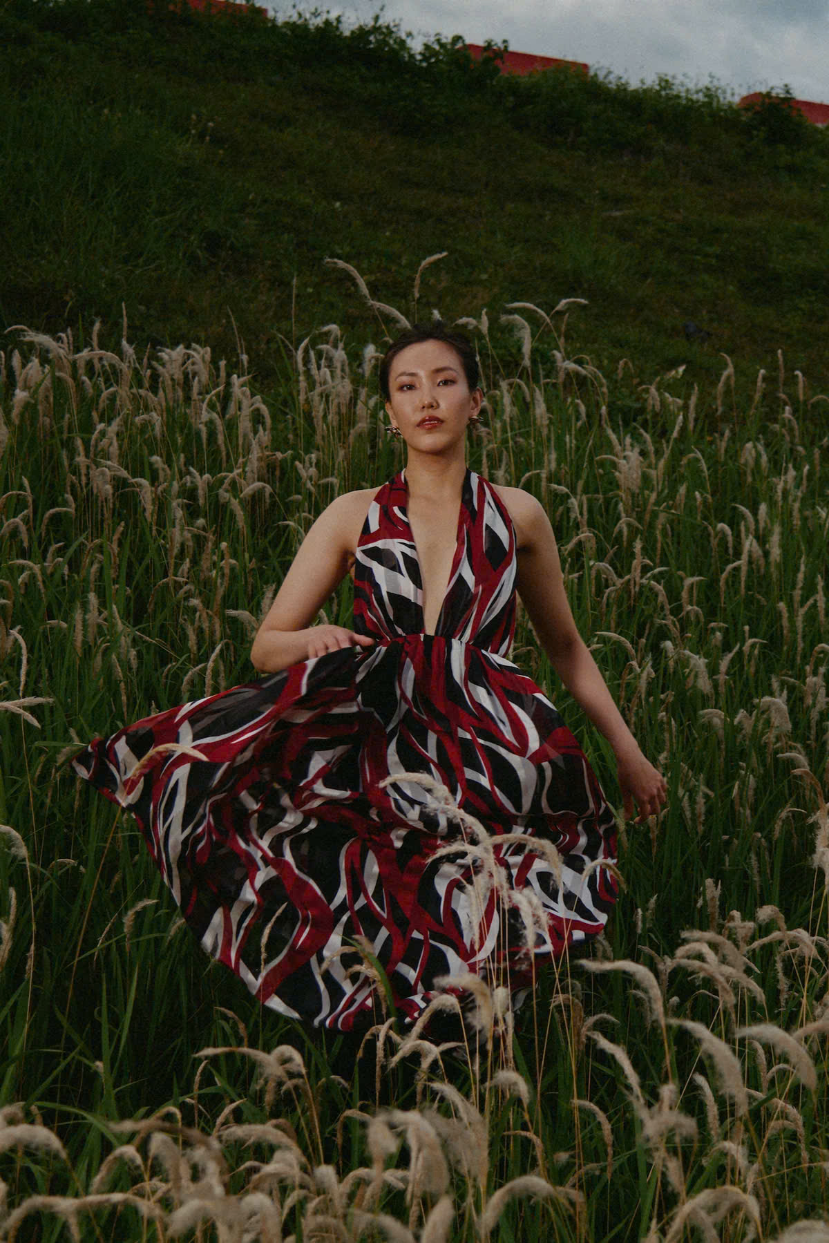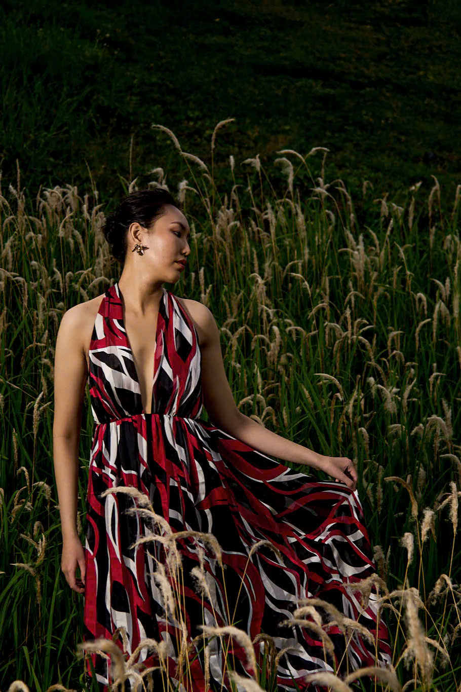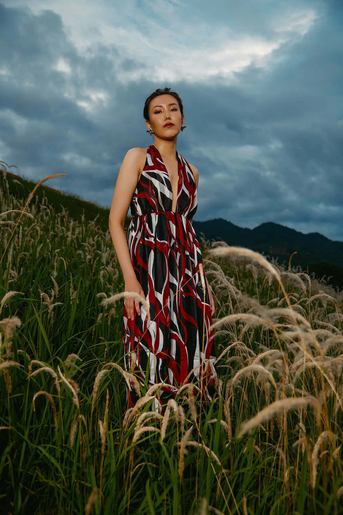 Chiếc đầm maxi hở lưng với họa tiết hình khối lượn sóng mạnh mẽ, trừu tượng đỏ đen trắng tương phản khiến chiếc đầm trở thành một tác phẩm thị giác mạnh mẽ, nơi từng chi tiết đều khẳng định cá tính riêng. Những đường nét xoắn vặn và uốn lượn mềm mại gợi nhịp điệu của vũ điệu, biểu tượng cho dòng chảy không ngừng của cuộc sống, sự linh hoạt và tự do. Phom dáng dài thướt tha được cân bằng bởi đường cắt táo bạo khoe lưng trần, tạo nên một bản tuyên ngôn thời trang đầy quyến lực: vừa gợi cảm với vẻ quyến rũ tiềm ẩn, vừa sang trọng với phong thái tự tin.